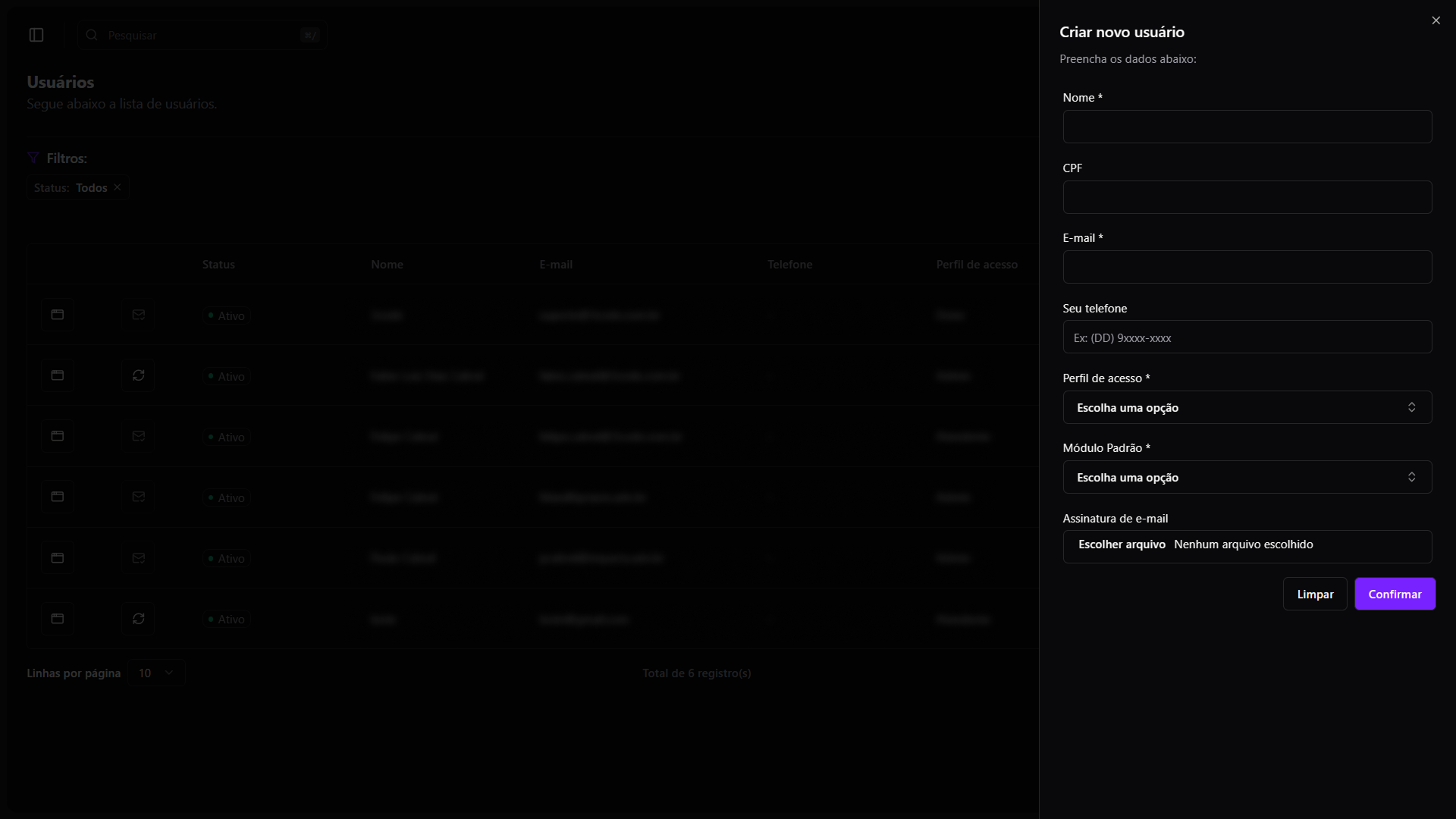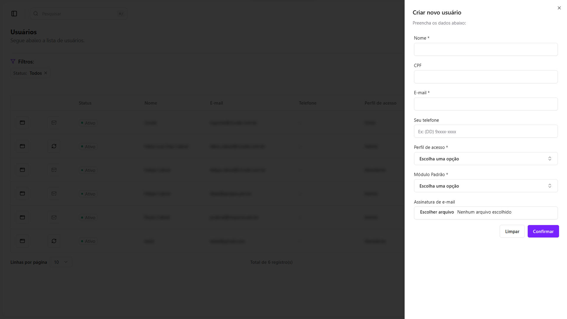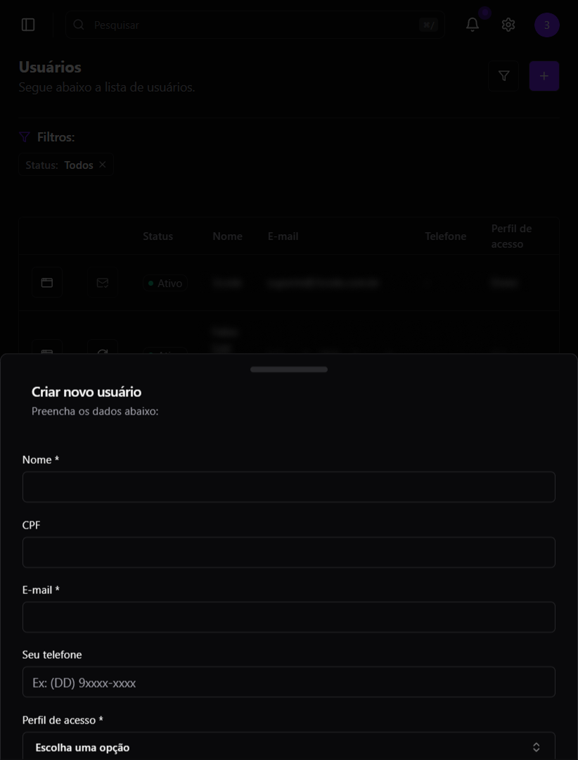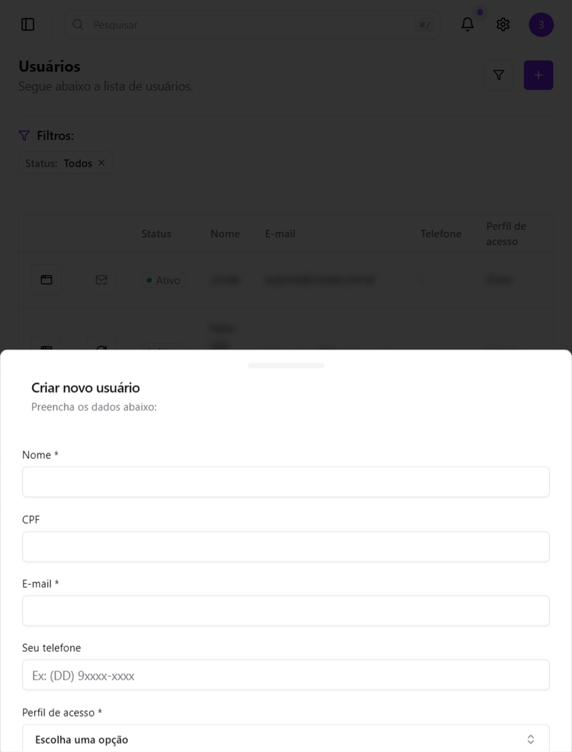 Ao clicar no botão “Criar novo”, uma aba lateral se abre na tela em dispositivos desktop, permitindo que o usuário preencha um formulário ou insira novas informações. Essa aba desliza a partir da lateral da interface e não carrega uma nova página, oferecendo uma experiência mais fluida e intuitiva.Em dispositivos móveis, o formulário é exibido em um modal que sobe a partir da parte inferior da tela, adaptando a interface para uma navegação mais confortável e eficiente em telas menores.