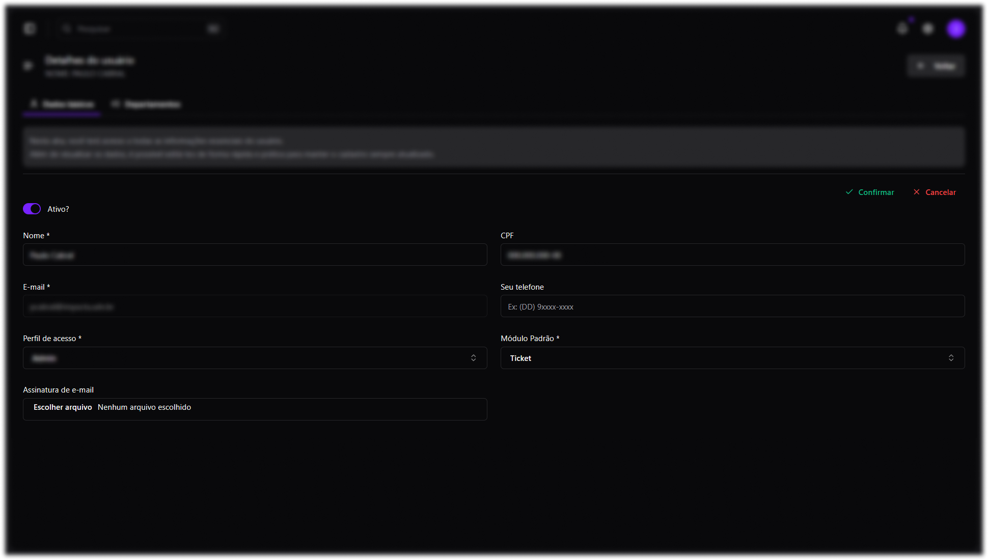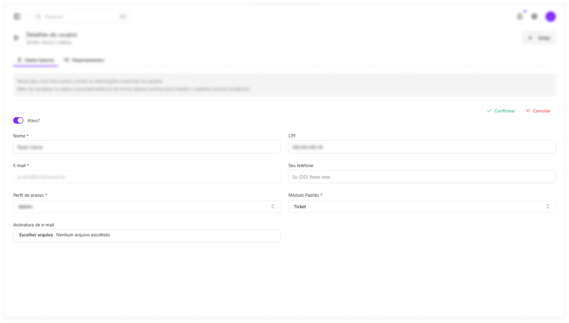 Clique no botão de editar ou diretamente nos campos habilitados para edição. Após ajustar os dados, clique em Confirmar para atualizar as informações no sistema de forma segura e eficiente.
