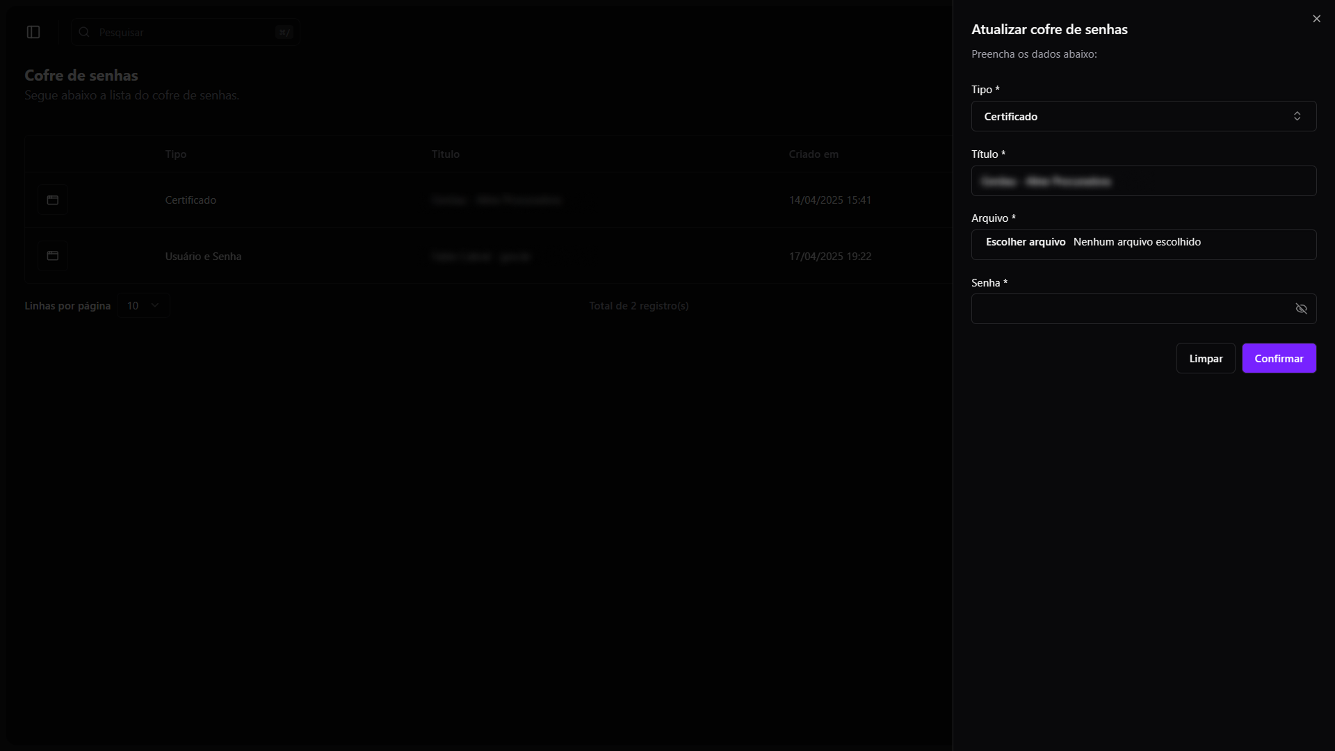 Presente em algumas telas, como Feriados, Cofre de Senhas, entre outras. Ao selecionar um item para editar, uma interface lateral é aberta, permitindo que o usuário atualize as informações de forma rápida, sem sair da tela principal. Essa abordagem combina agilidade com praticidade, mantendo o contexto da visualização.