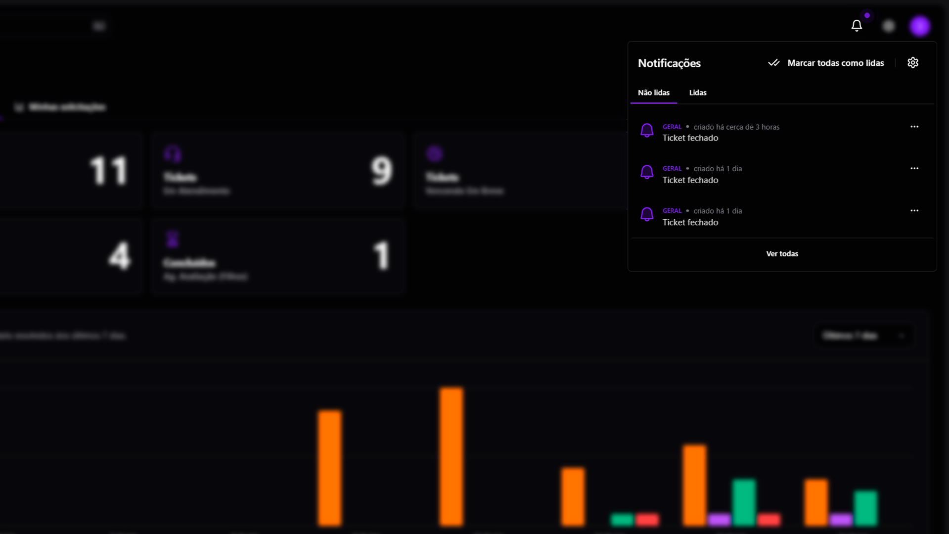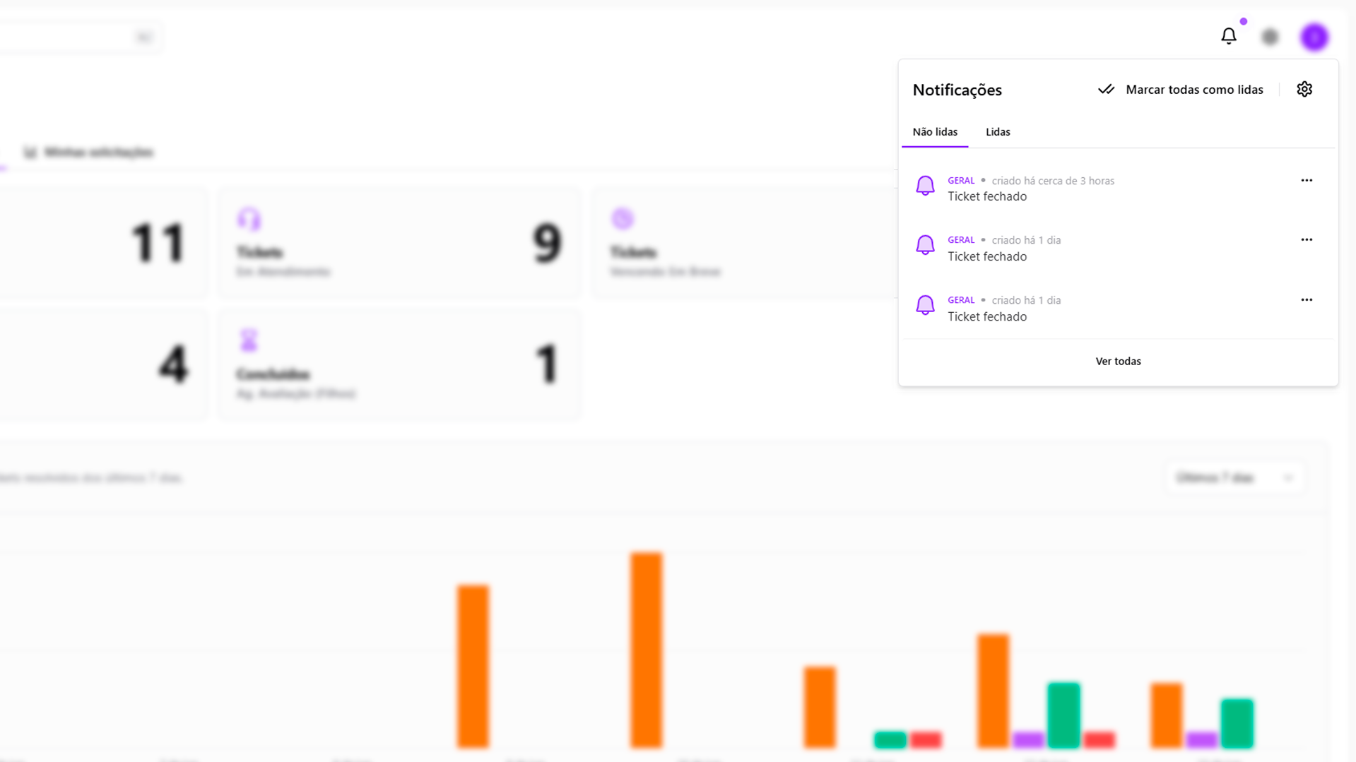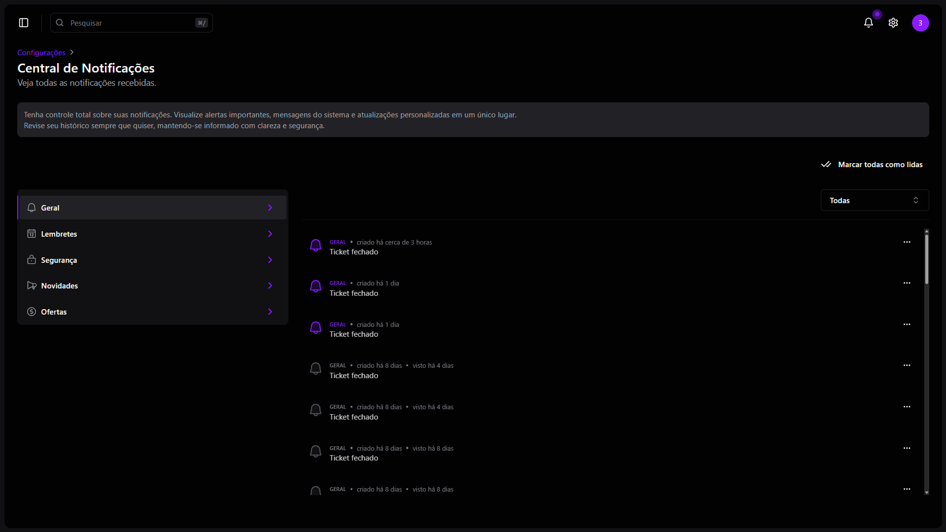 As notificações são organizadas em diferentes categorias para facilitar o acesso e o entendimento:- Geral: Informações sobre movimentações importantes como encerramento de tickets.