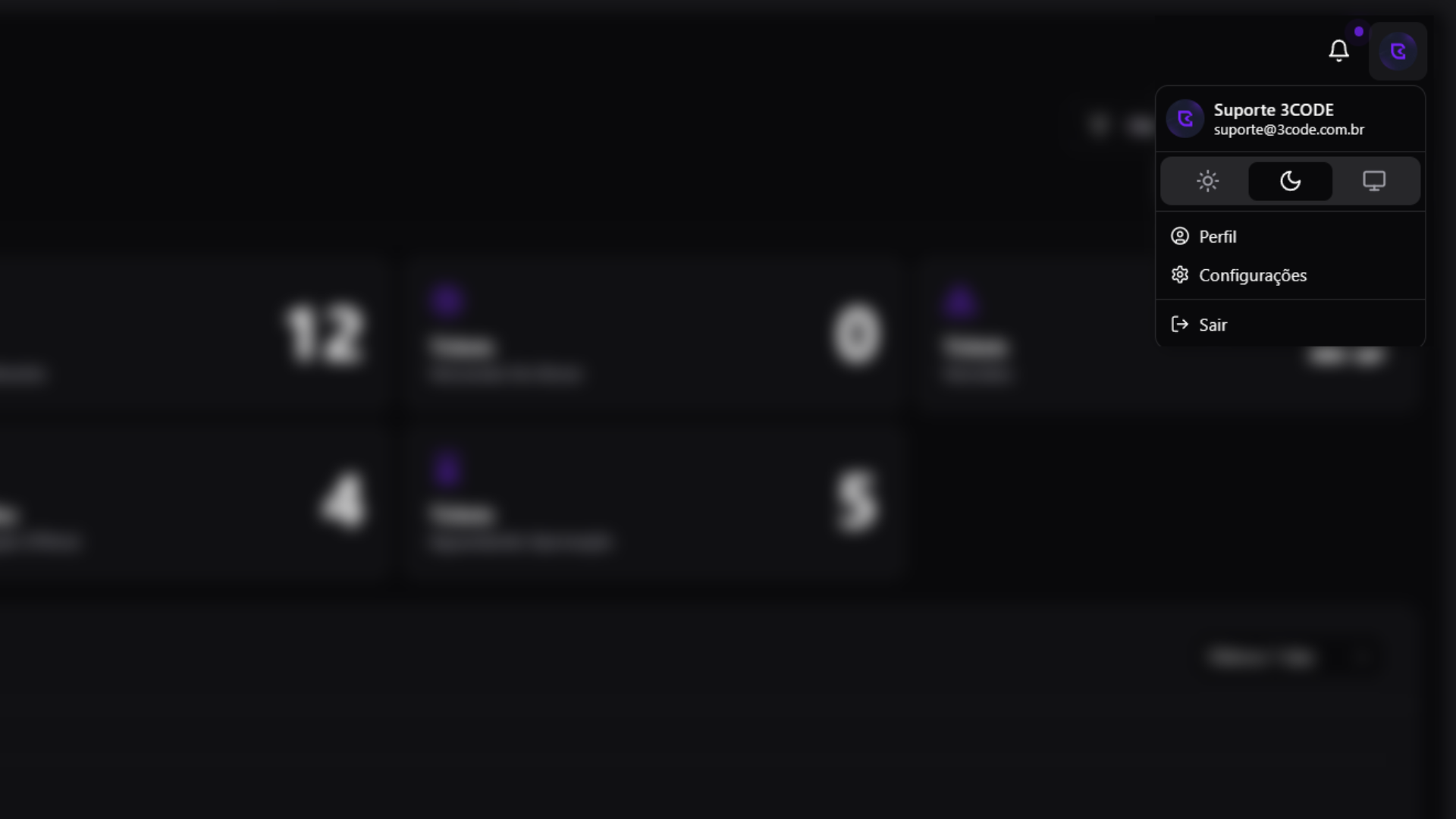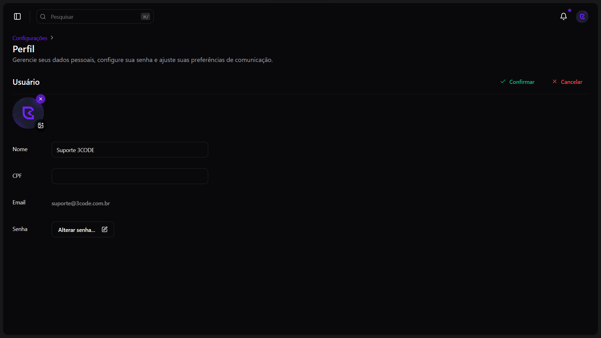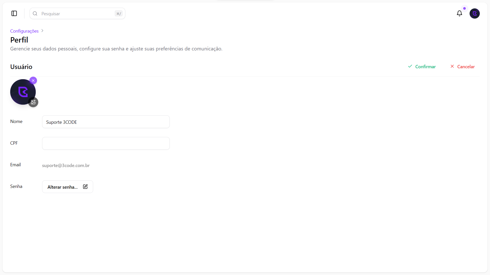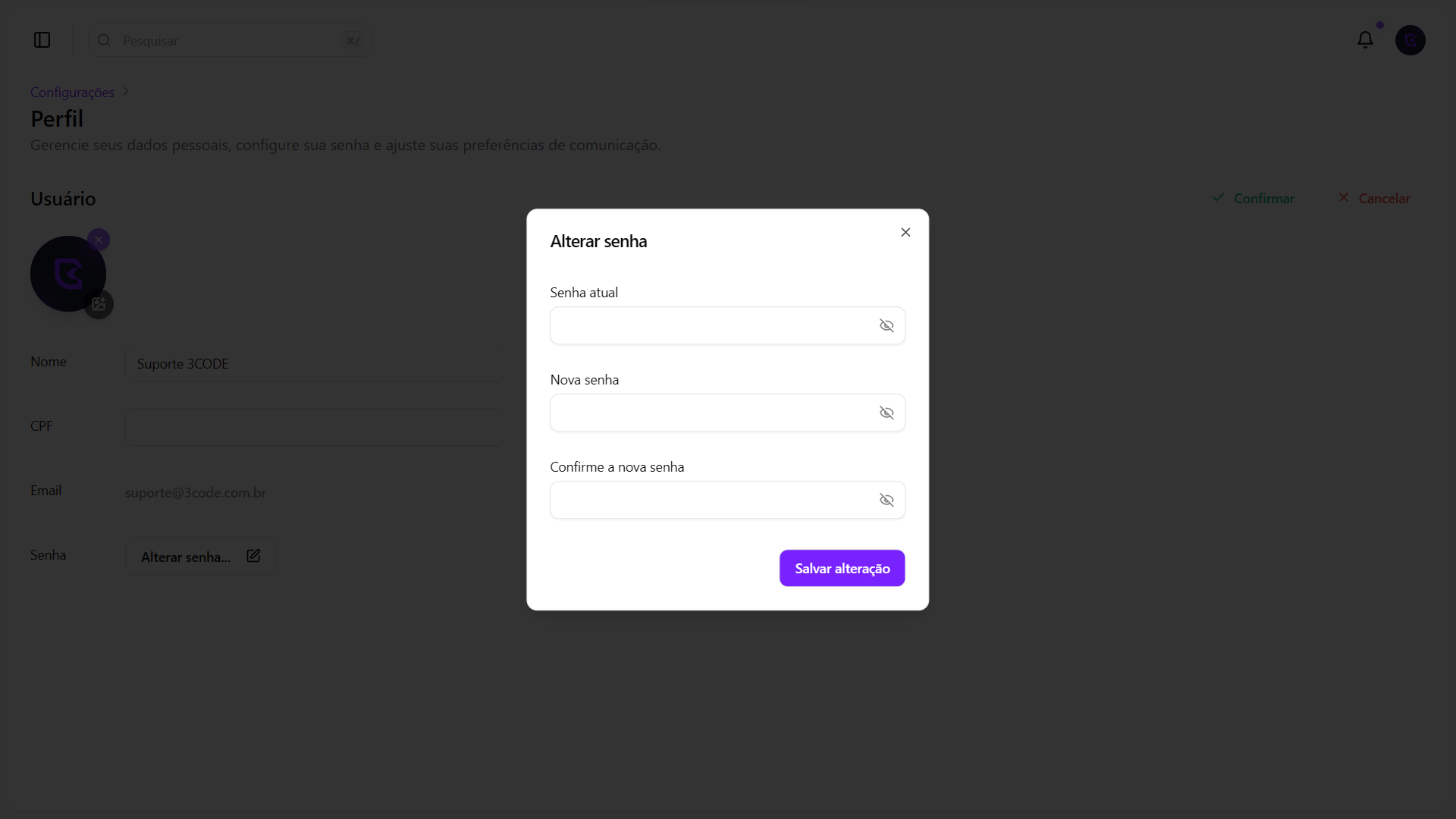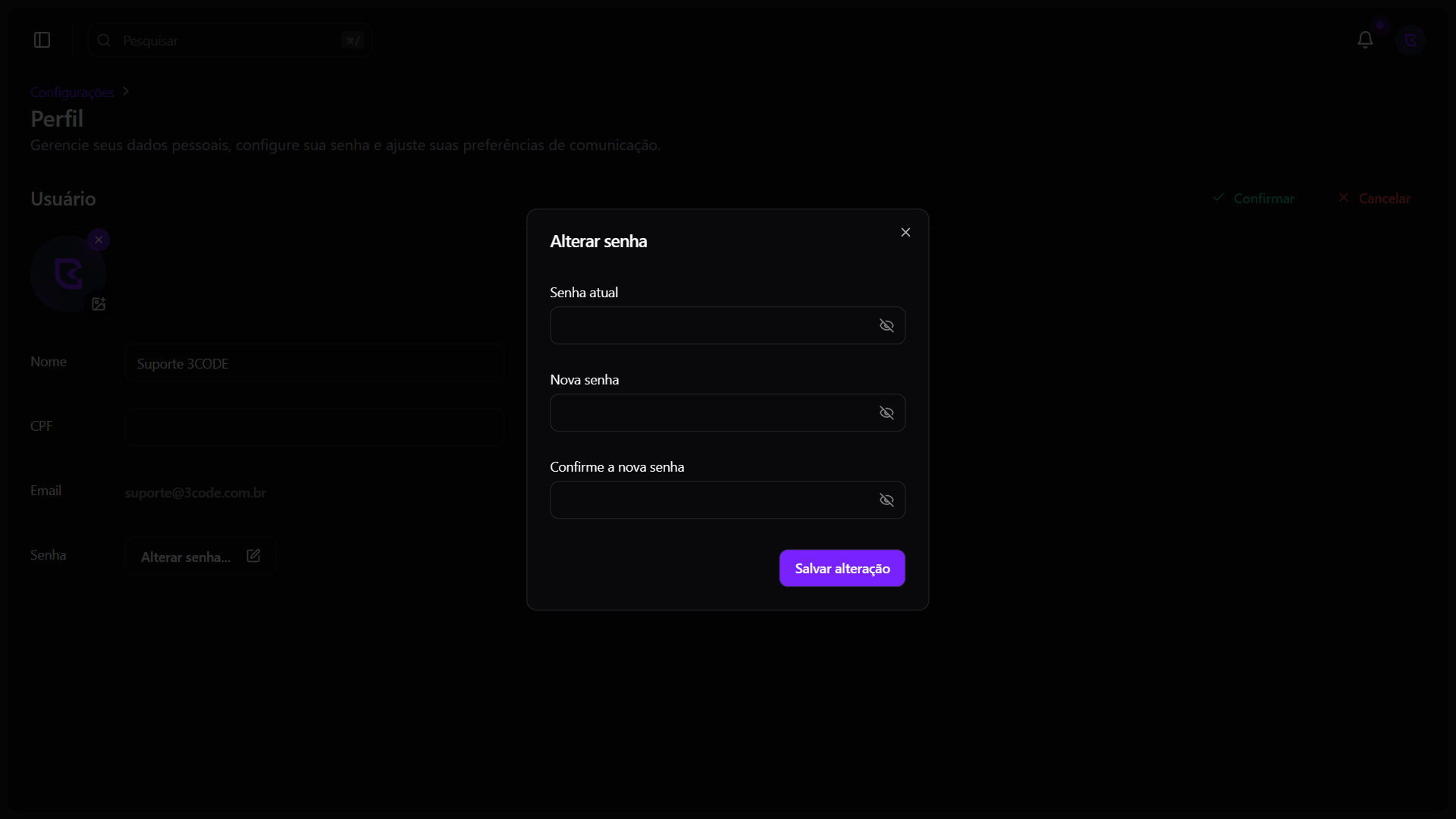 Para alterar sua senha, clique no botão Alterar senha. Abrirá um modal onde você poderá inserir sua senha atual, a nova senha e confirmá-la. Após preencher os campos, clique em Confirmar para aplicar as alterações.