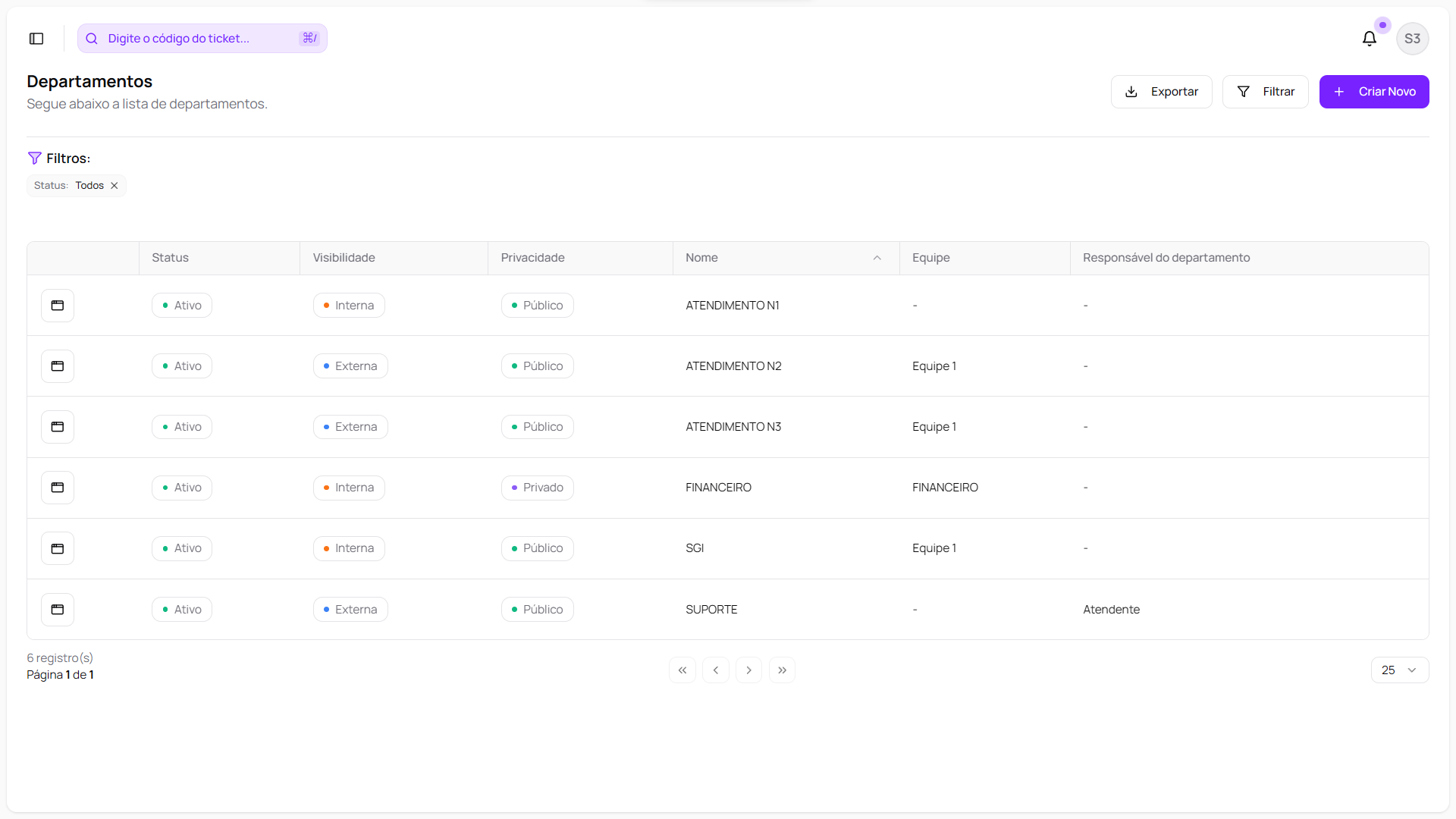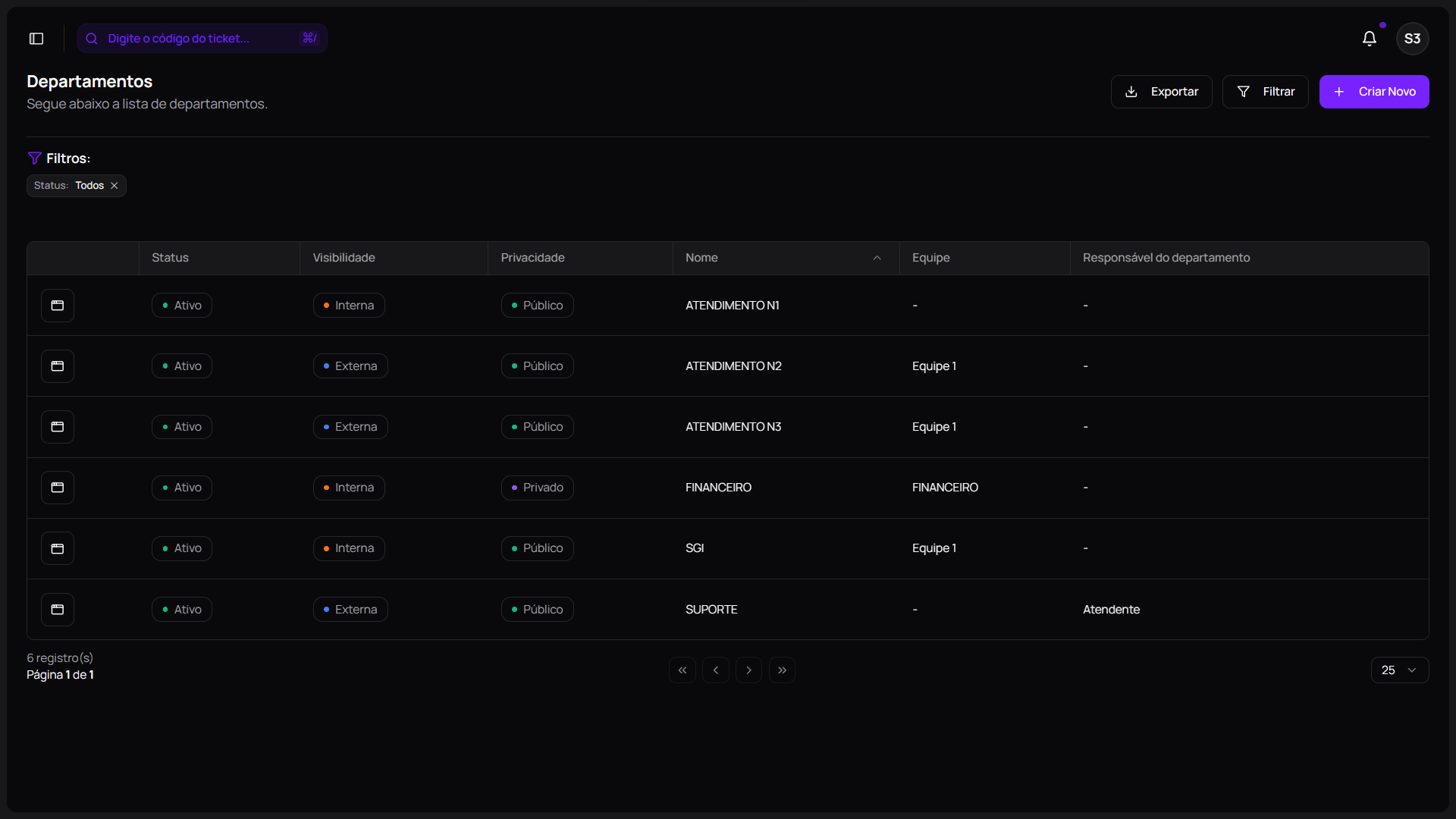 Departamento é uma unidade organizacional dentro do sistema de tickets que agrupa usuários e define responsabilidades para o atendimento de chamados. Ele permite que os tickets sejam direcionados para a equipe ou setor adequado, melhorando a eficiência no gerenciamento de solicitações. Aqui você pode:- Visualizar todos os departamentos cadastrados
