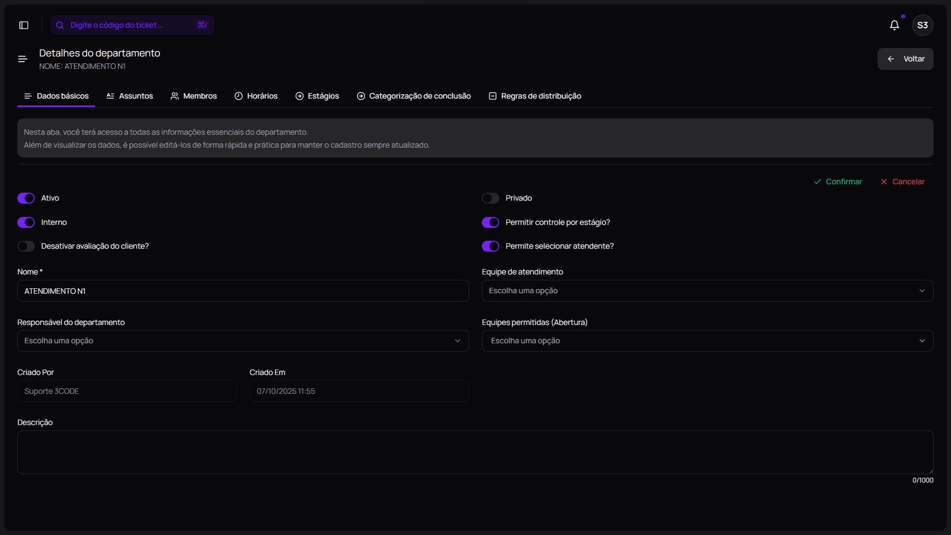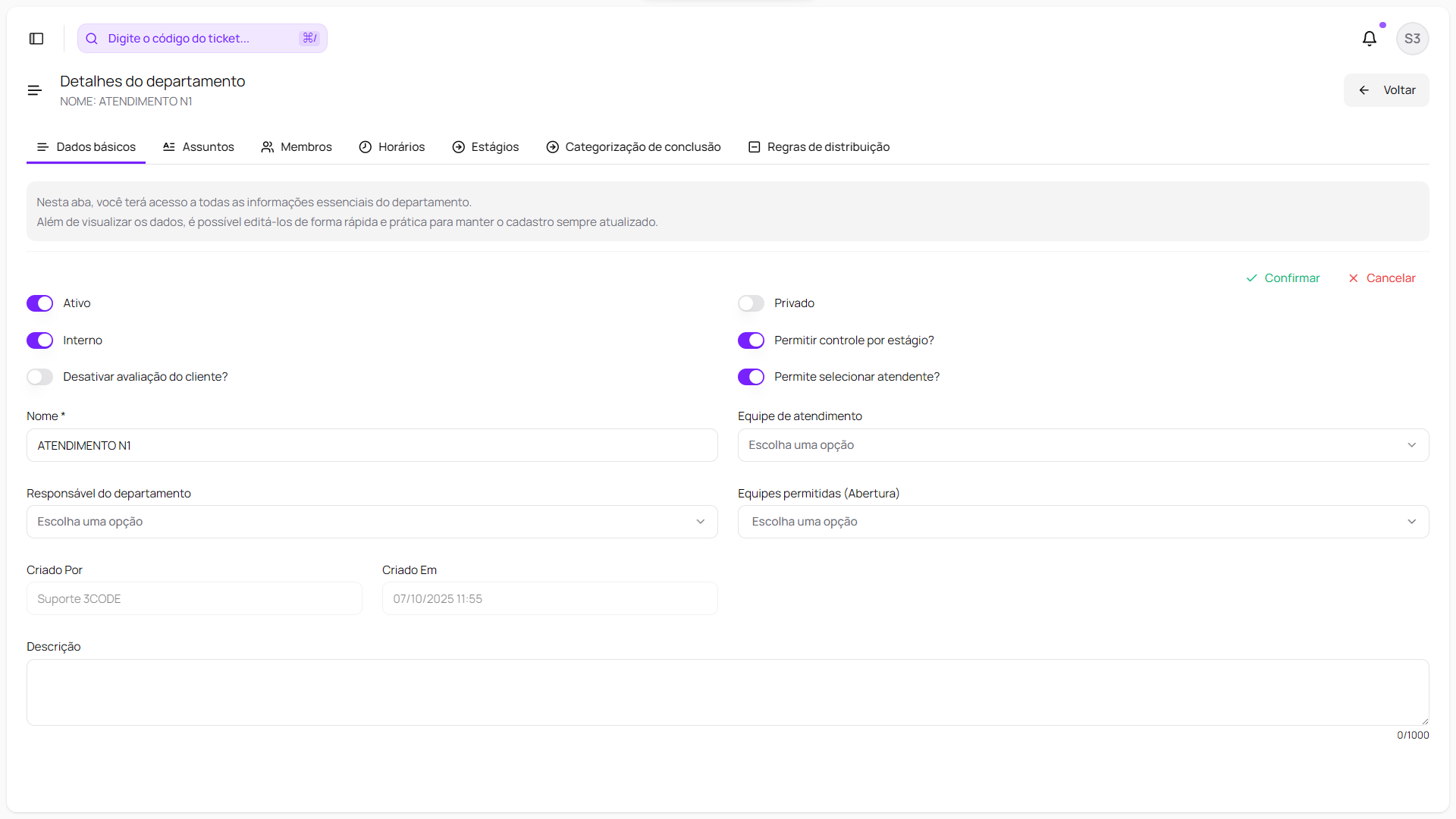 Nesta seção, você pode visualizar e editar as informações principais do departamento, como nome, descrição e status. É possível ativar ou desativar o departamento, definir se ele é interno e configurar opções complementares conforme o tipo selecionado.