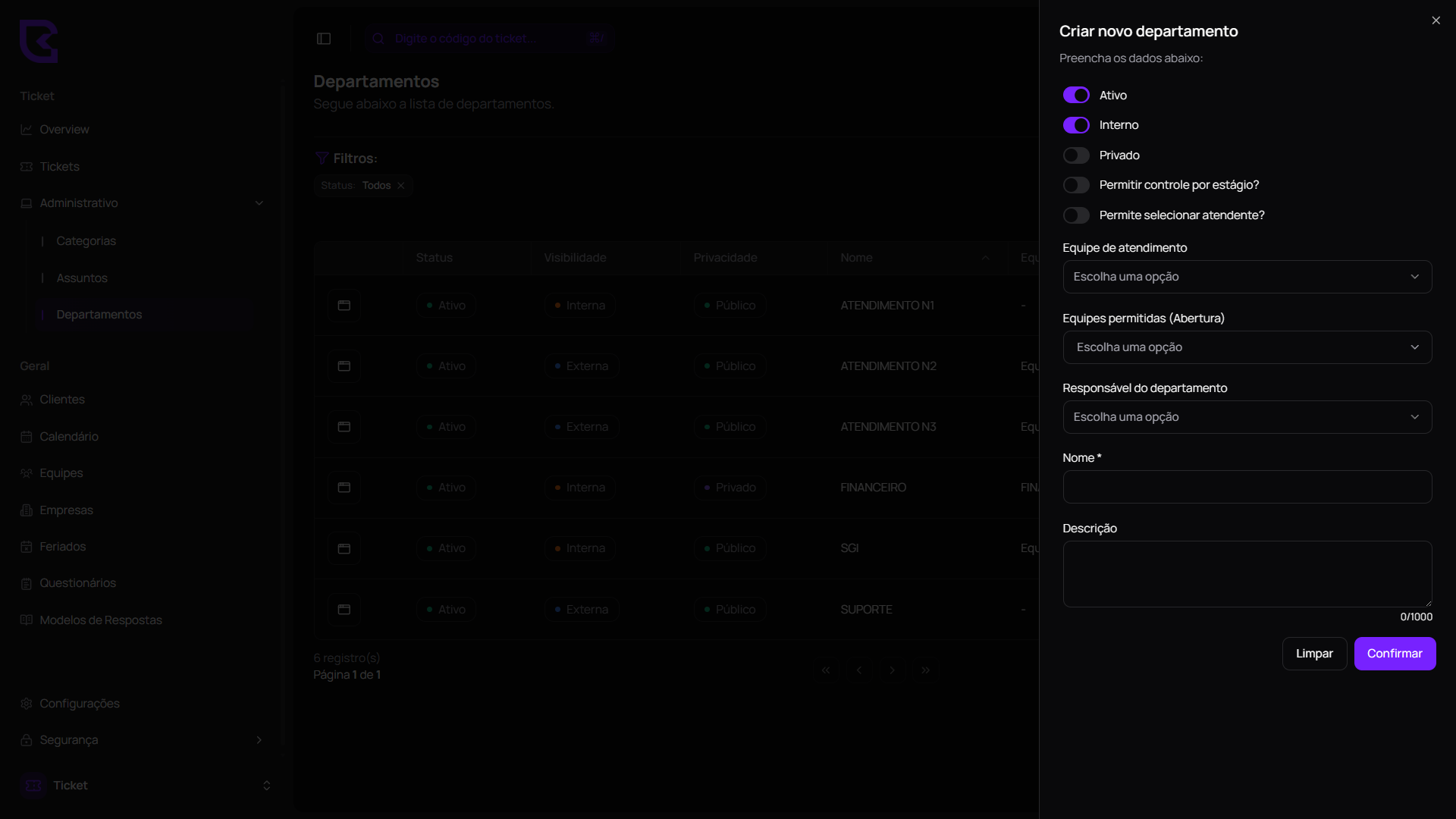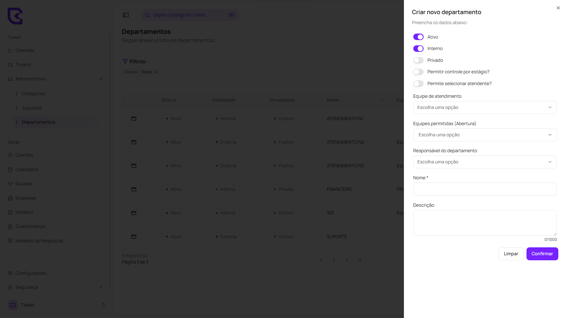 - Permite selecionar atendente? Permite que o responsável pelo ticket seja definido no momento da criação.