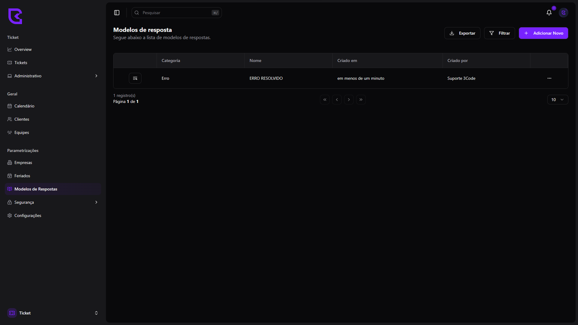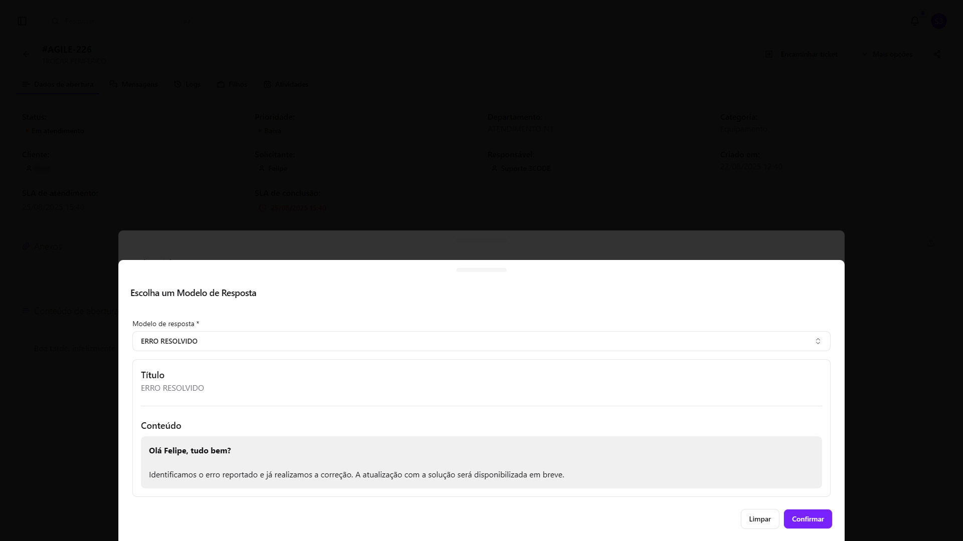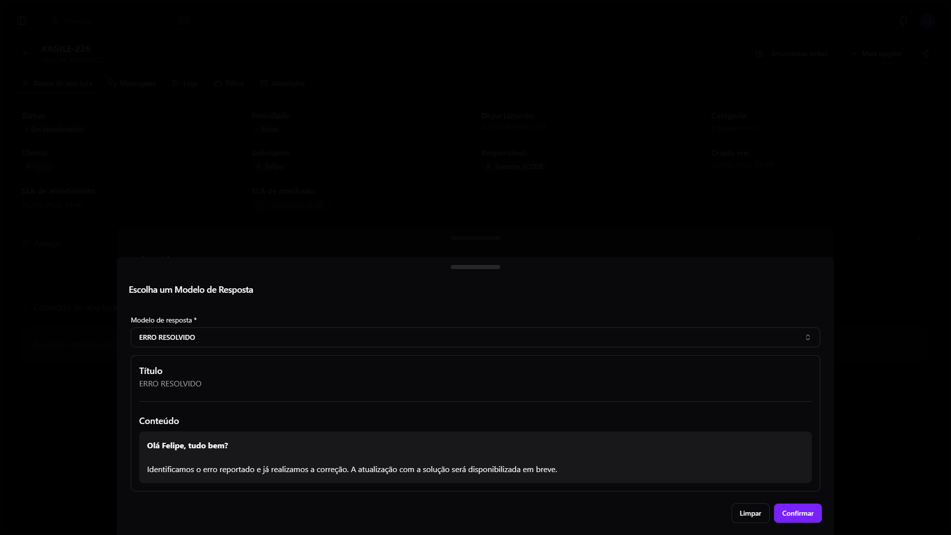 O atendente pode utilizar o modelo de resposta em dois contextos:- Na aba de mensagens → ao responder um ticket em andamento.