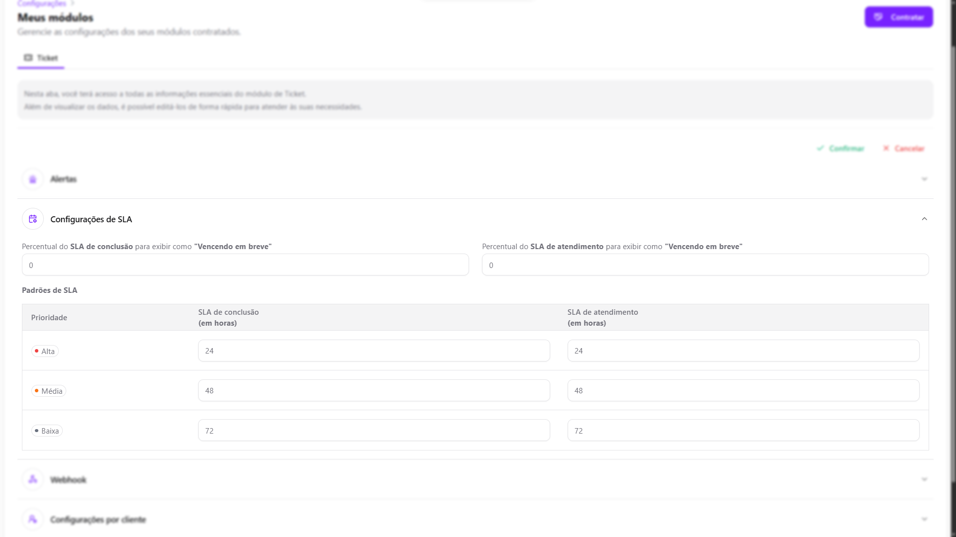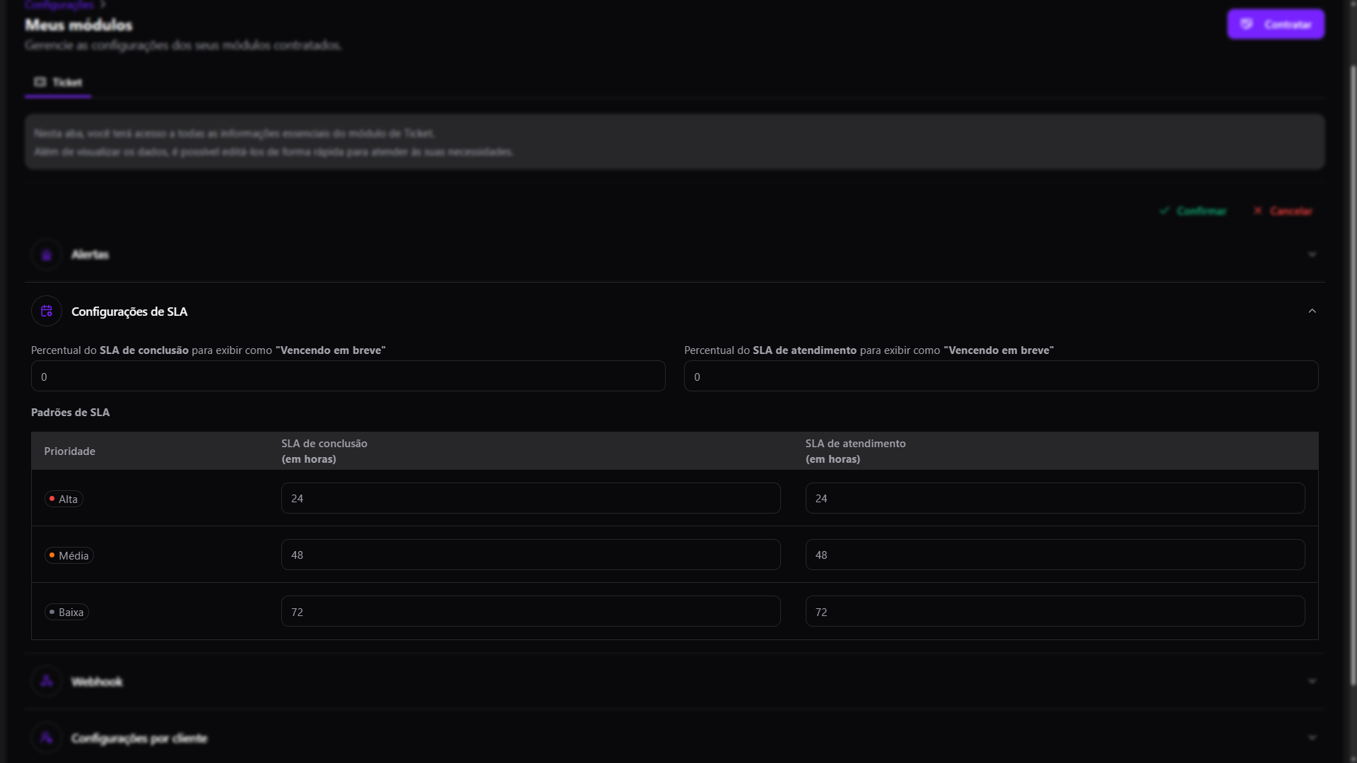 - É possível configurar valores padrão de SLA para cada prioridade (Alta, Média, Baixa) na aba de Configurações de SLA.