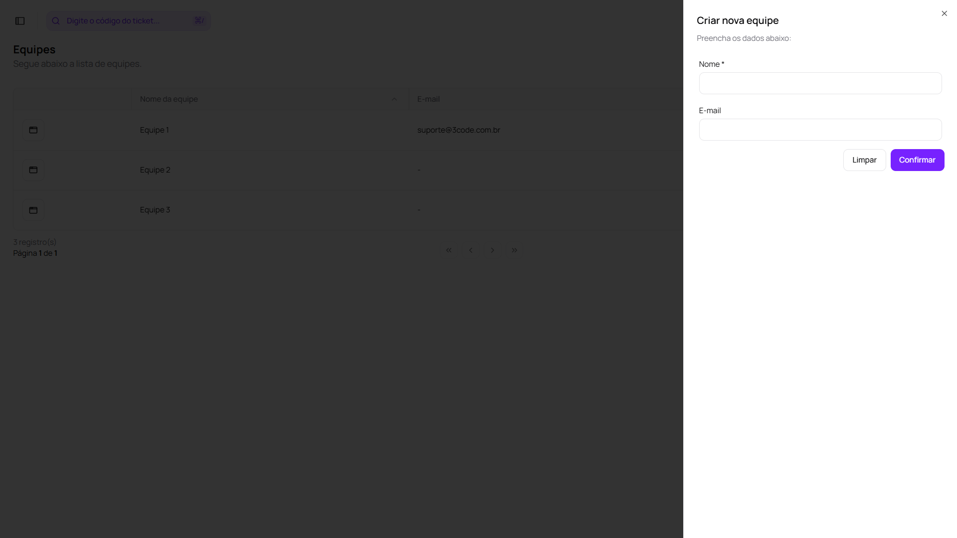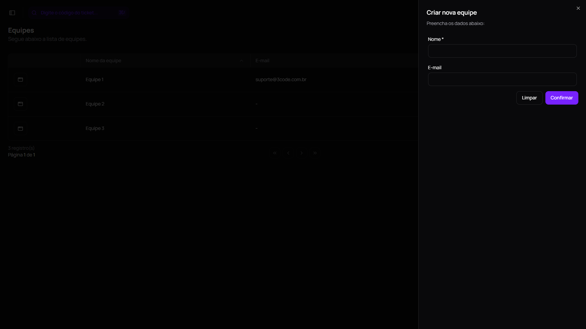 Para adicionar uma nova equipe, clique no botão Criar Novo. Um formulário será exibido para o preenchimento das informações da equipe.