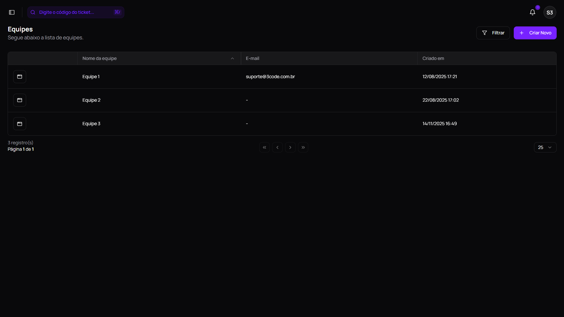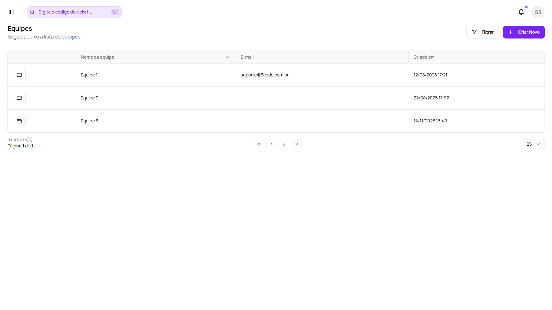 A lista exibe todas as equipes cadastradas no sistema, permitindo visualizar, criar, editar ou excluir equipes conforme a necessidade da organização.