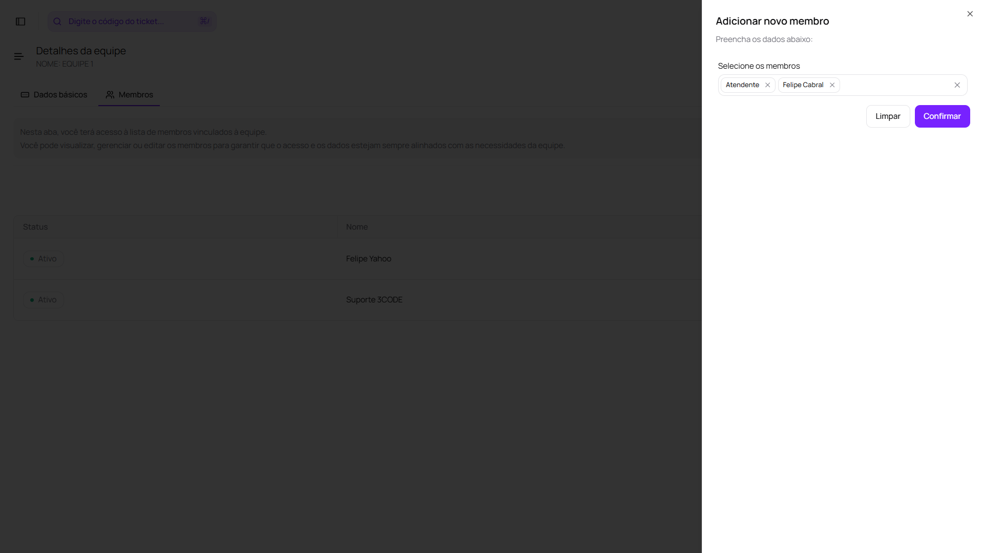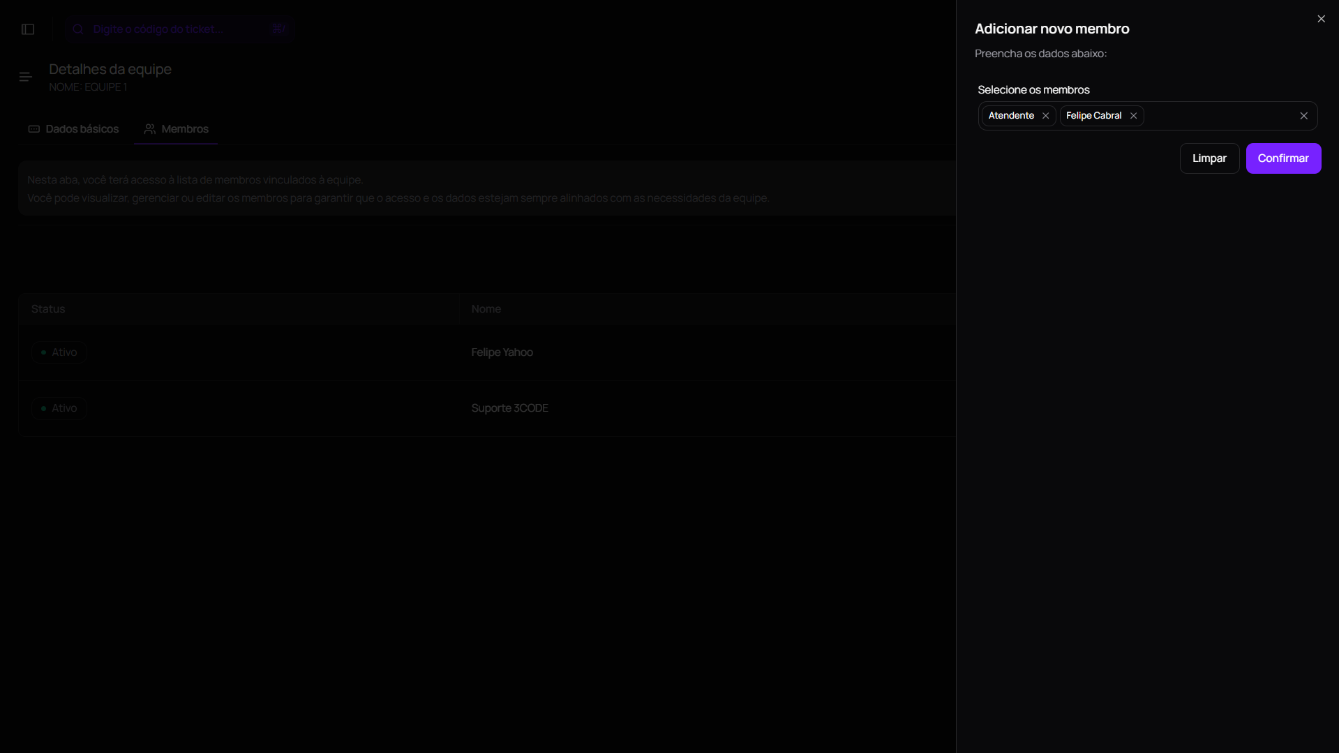Para realizar alterações, clique em Editar e, após concluir, em Confirmar.Também é possível excluir a equipe clicando em Excluir. O sistema solicitará uma confirmação antes de concluir a exclusão.