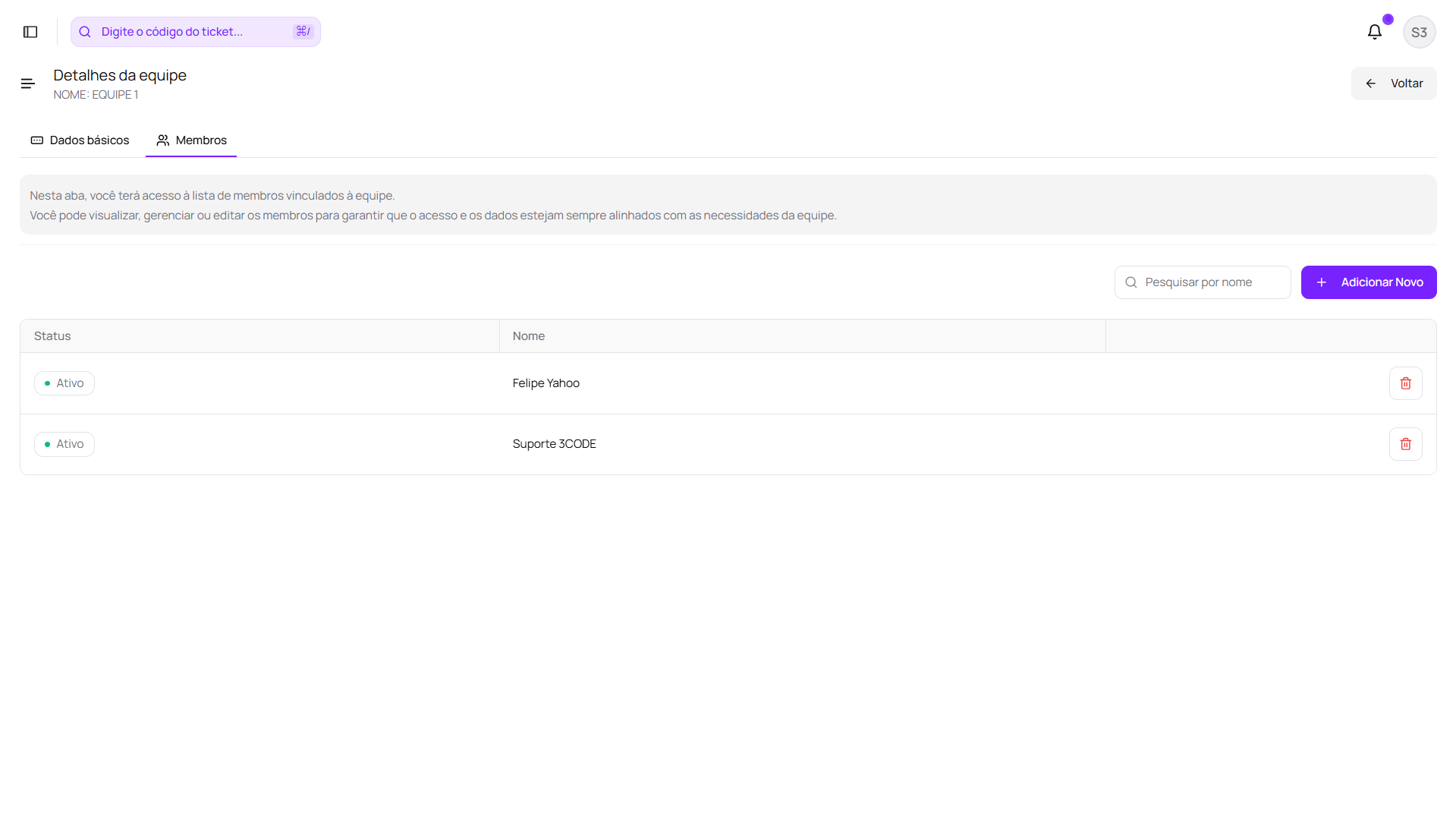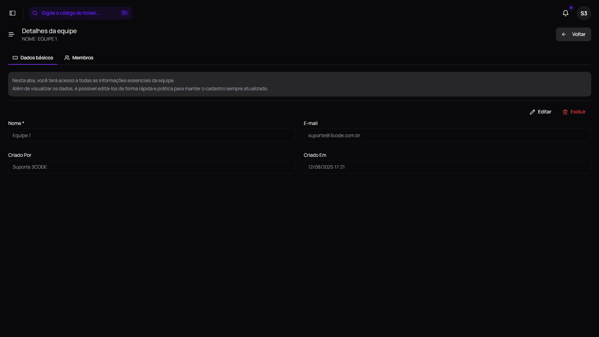 A tela de detalhes da equipe exibe as informações principais e permite gerenciar seus dados e membros. Ela pode ser acessada ao clicar no ícone de detalhes na lista de equipes.Detalhes da equipe