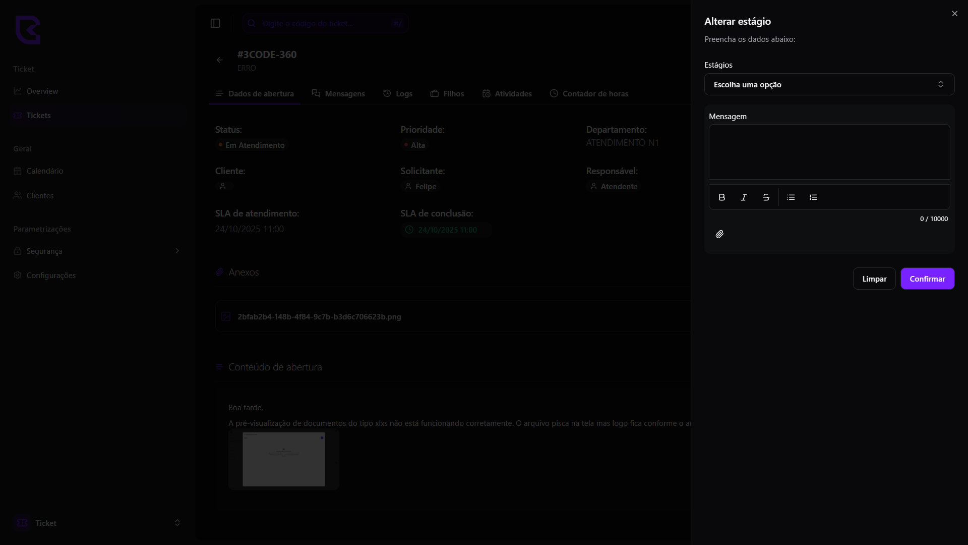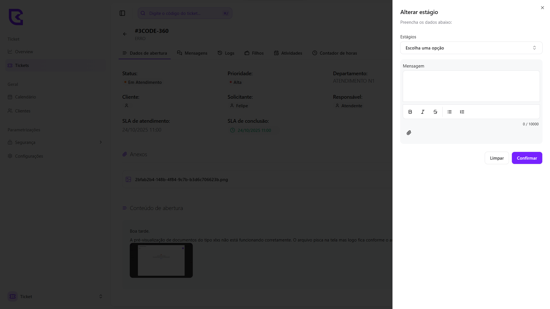 A funcionalidade de troca de estágio permite alterar a etapa em que um ticket se encontra dentro do fluxo de atendimento do departamento. Os estágios representam as etapas personalizadas criadas pelo próprio departamento, organizando o processo desde a abertura até o encerramento do ticket. Essa ação está disponível apenas para o usuário que abriu o ticket e possui permissão para alterar o estágio, ou para usuários com perfil de Supervisor. Além disso, a troca só estará disponível caso o departamento tenha estágios configurados em seu fluxo. Quando há estágios definidos, é possível mover o ticket entre essas etapas conforme o andamento do atendimento, garantindo que os processos internos sejam seguidos corretamente. A troca de estágio é uma forma de registrar e visualizar o progresso do ticket, facilitando o controle das demandas e a comunicação entre os membros da equipe. Se quiser saber mais sobre configuração do departamento, clique aqui.