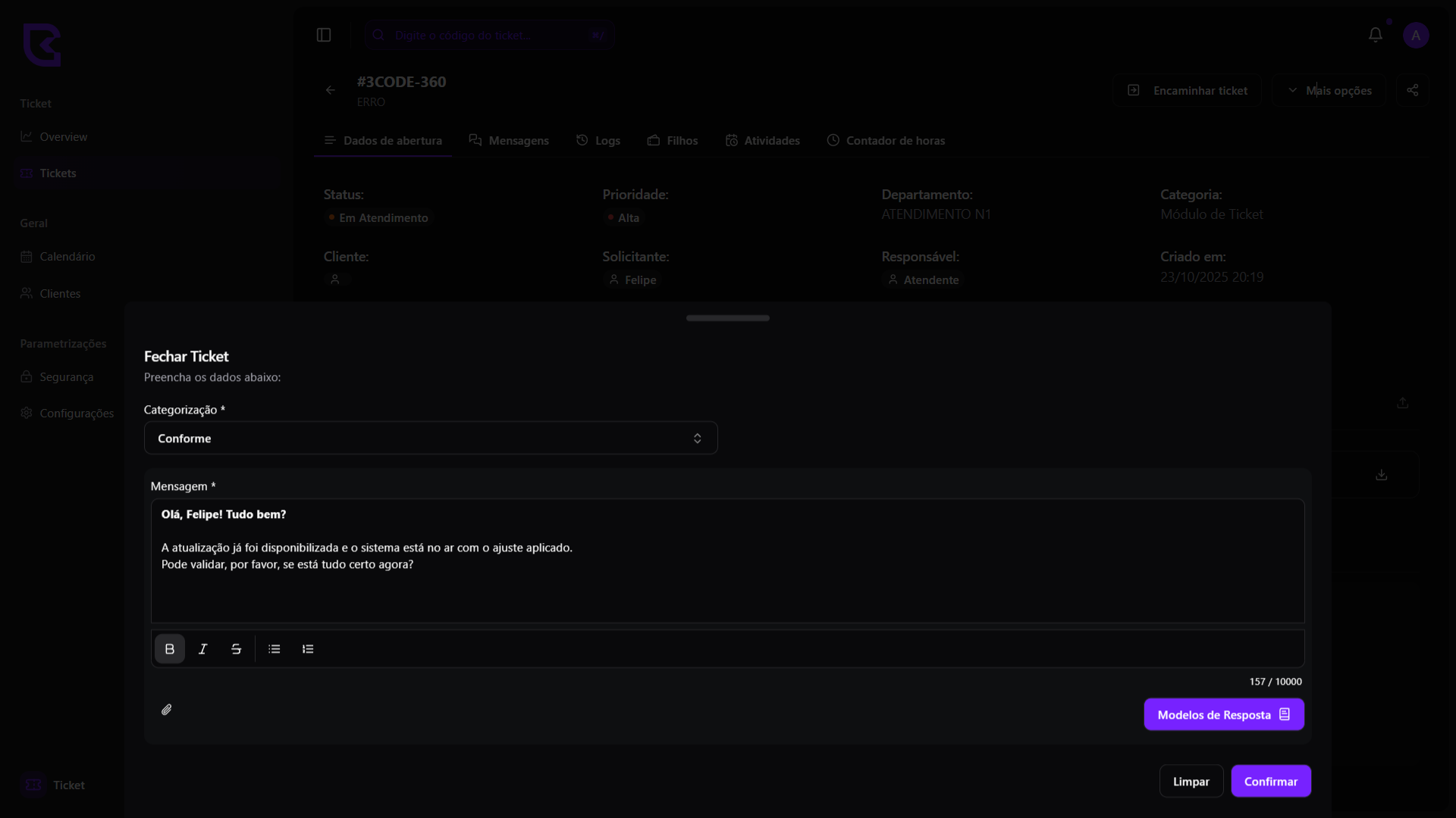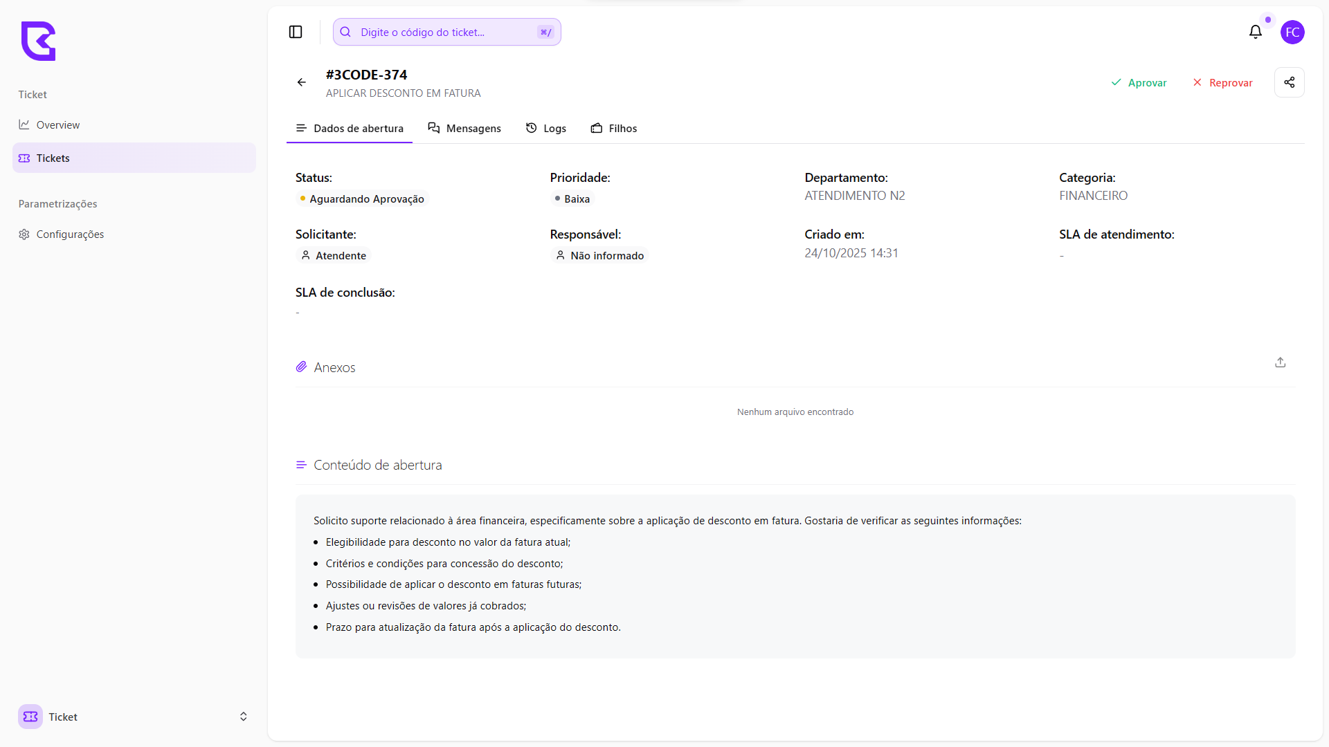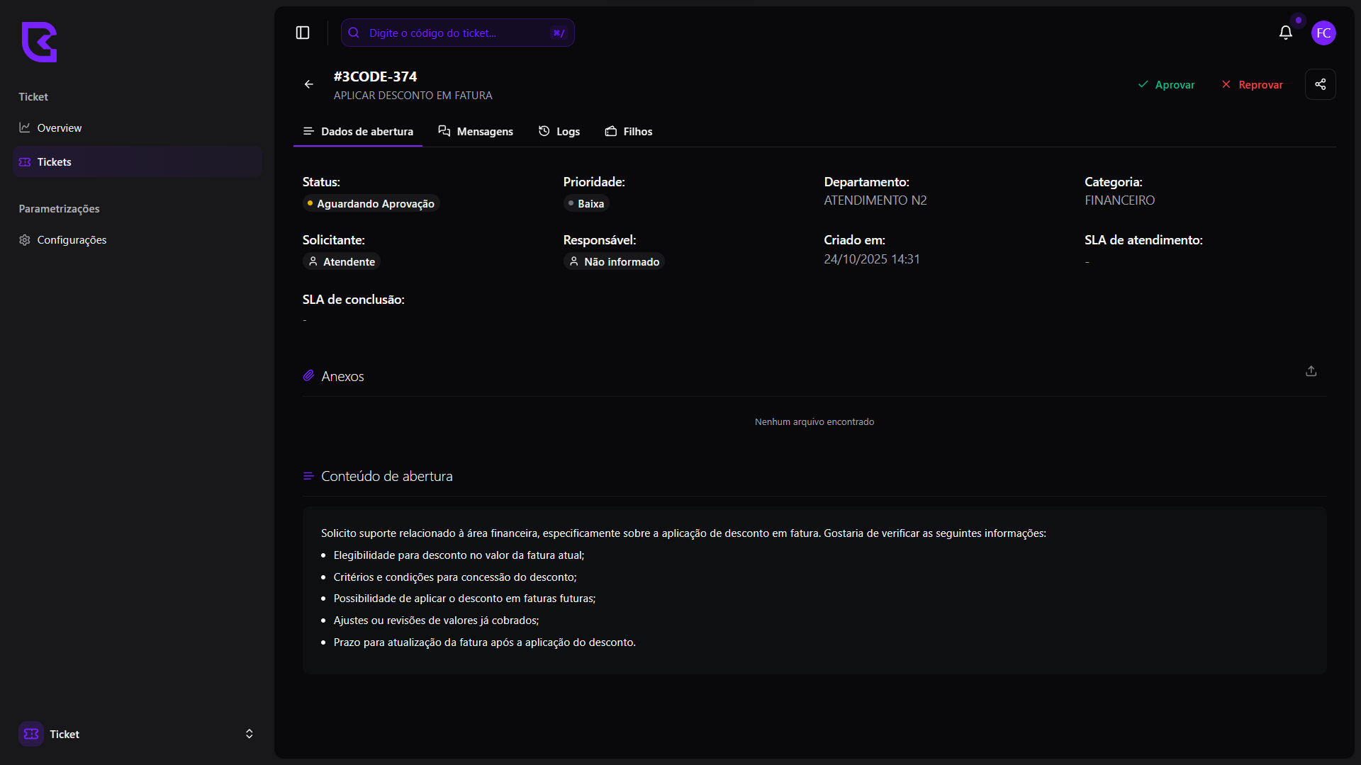 aprovação de um gerente ou responsável).Após a aprovação, o ticket será automaticamente atualizado para o status Pendente, permitindo o seguimento normal do atendimento pela equipe responsável.