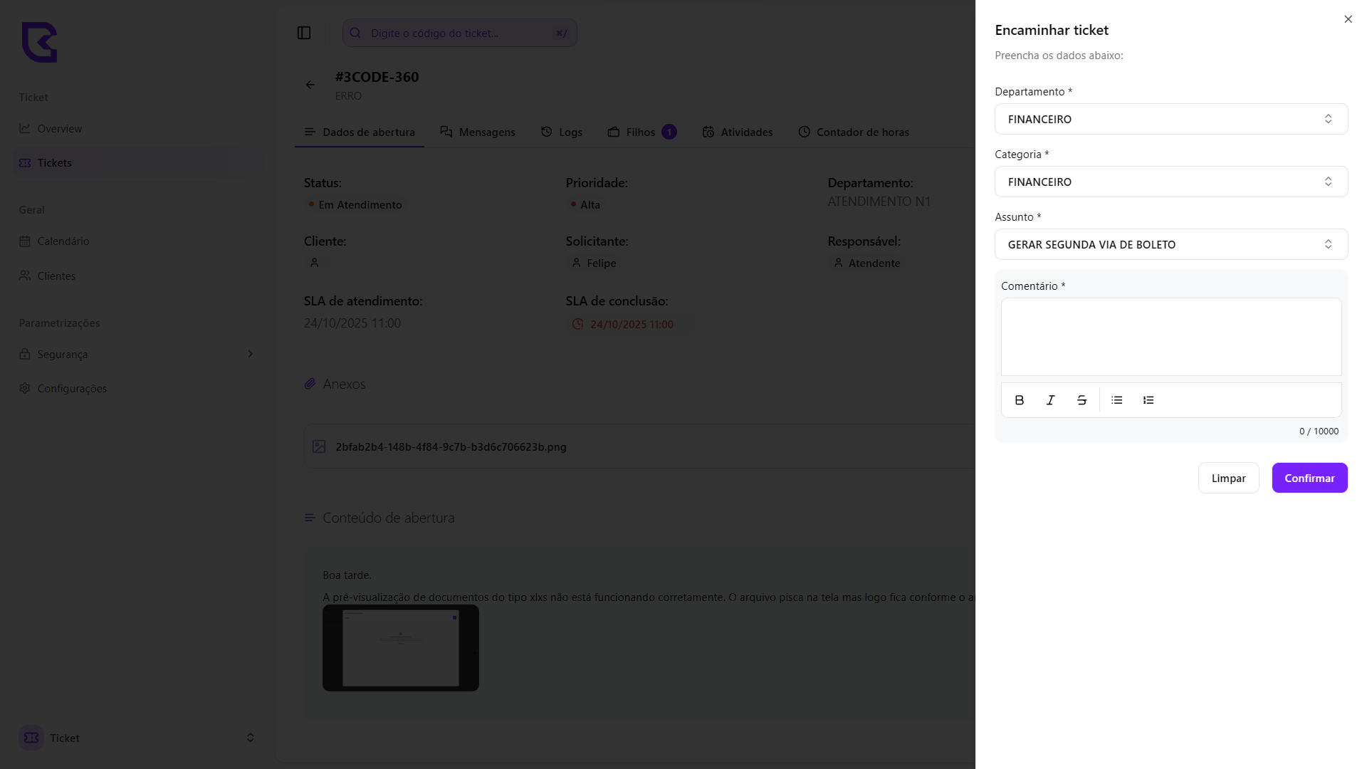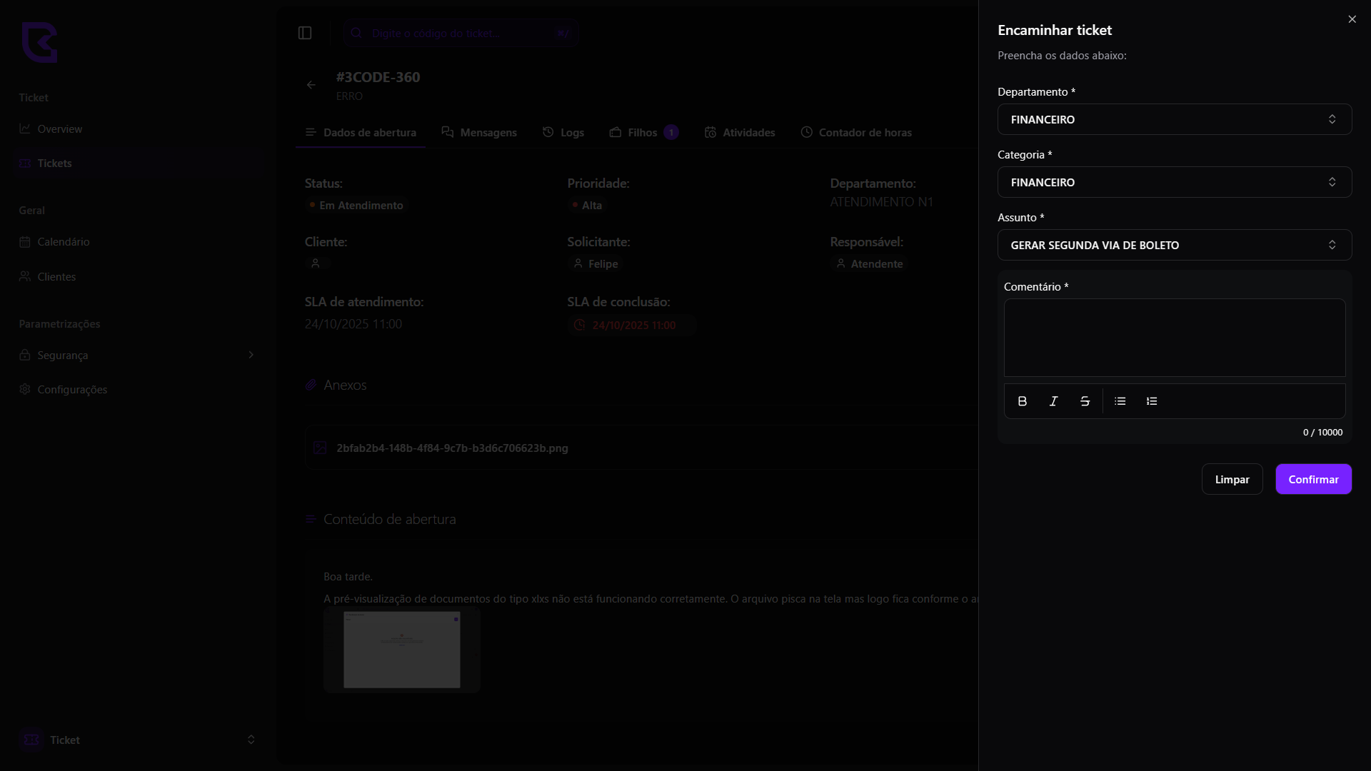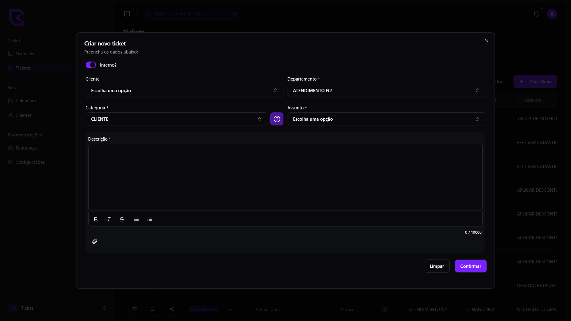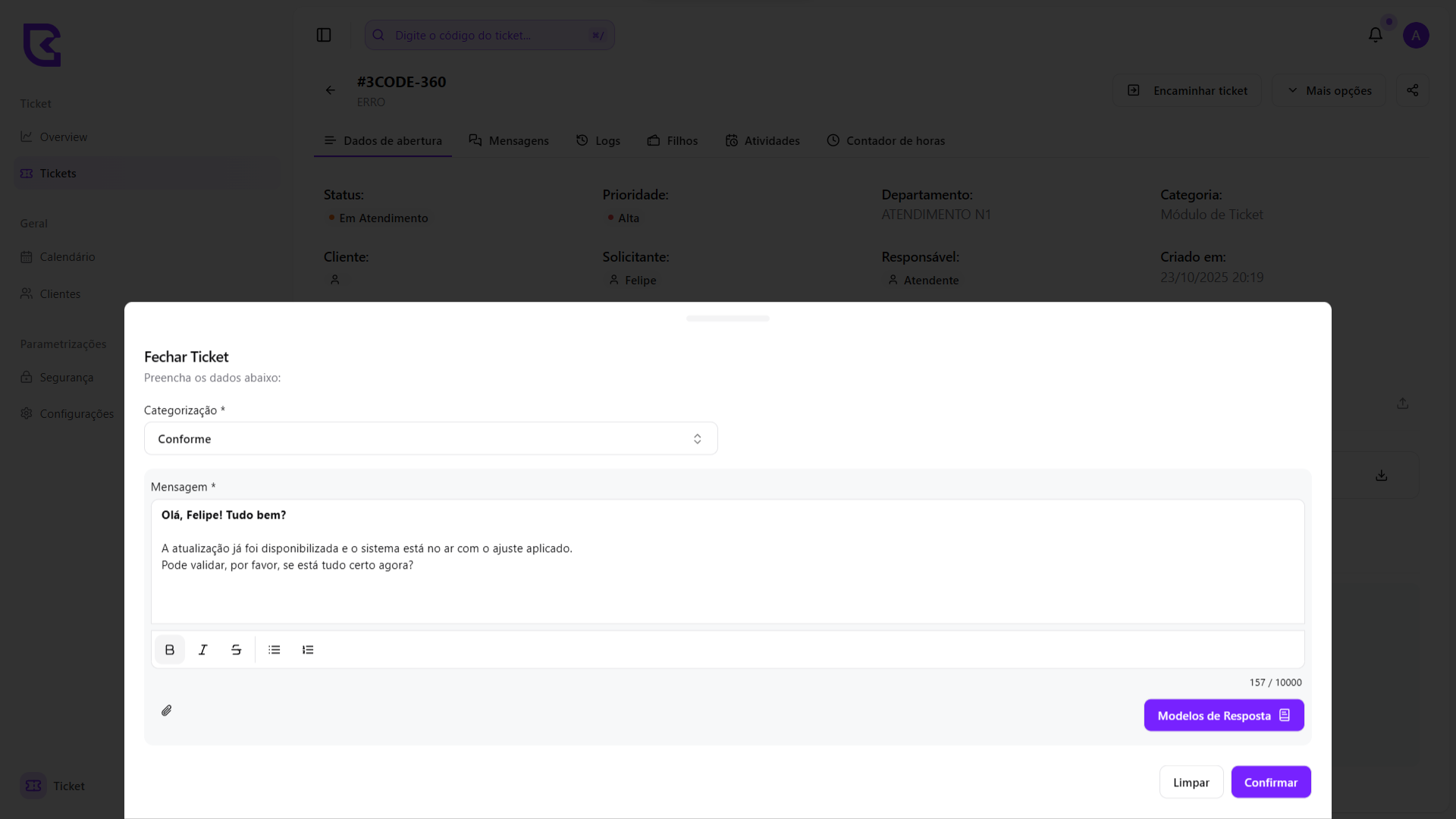 aprovação de um gerente ou responsável).Após a aprovação, o ticket será automaticamente atualizado para o status Pendente, permitindo o seguimento normal do atendimento pela equipe responsável.