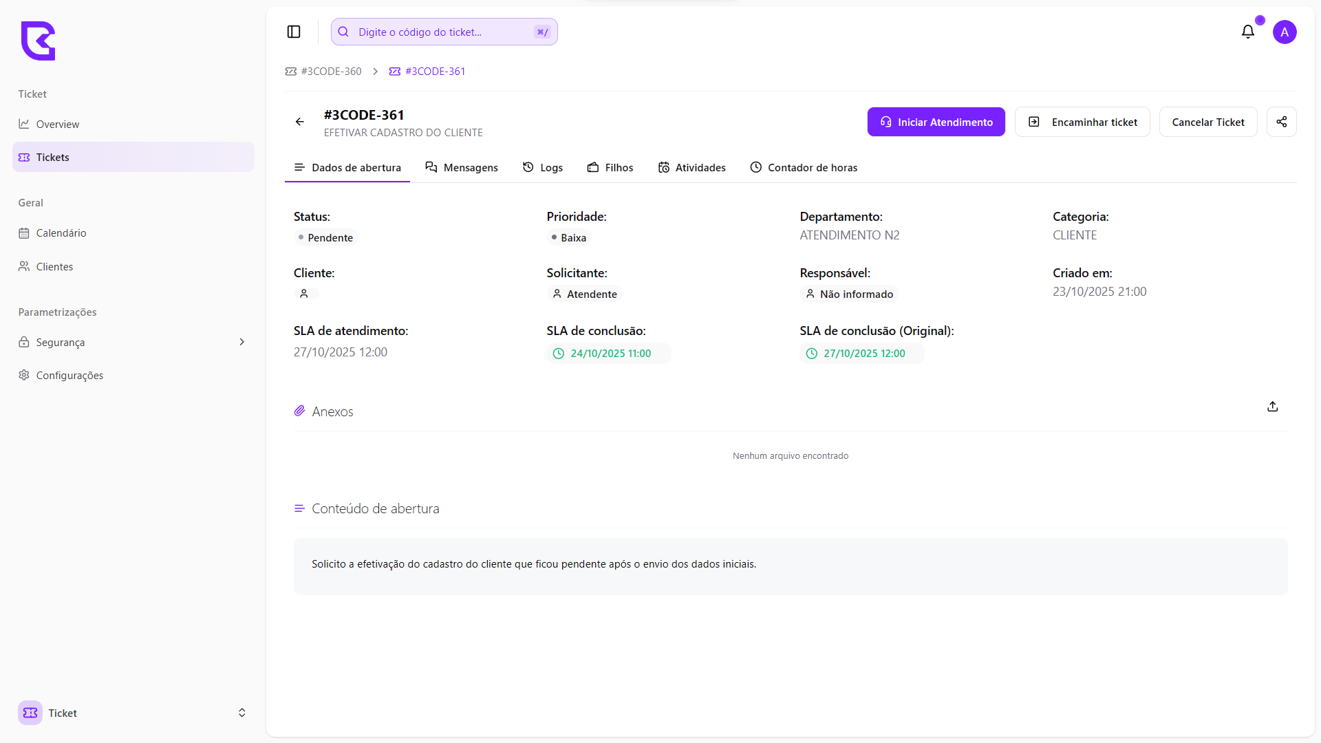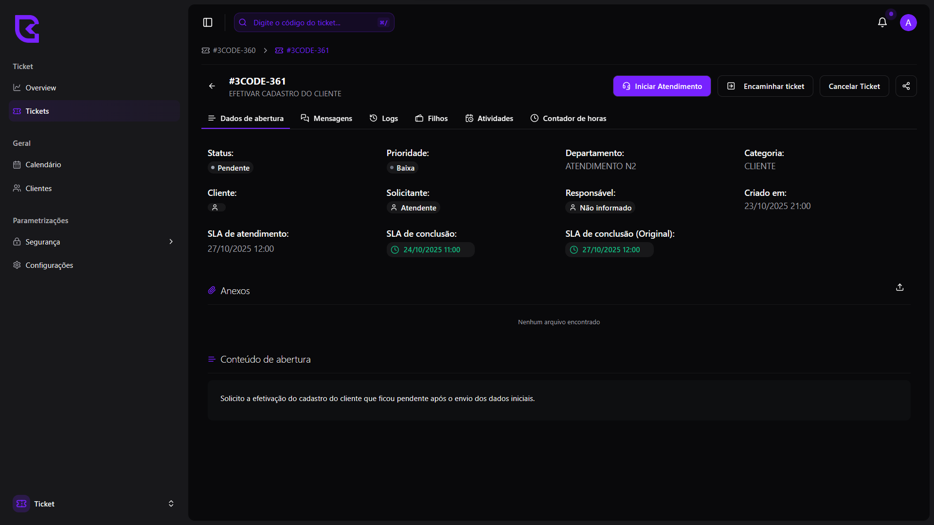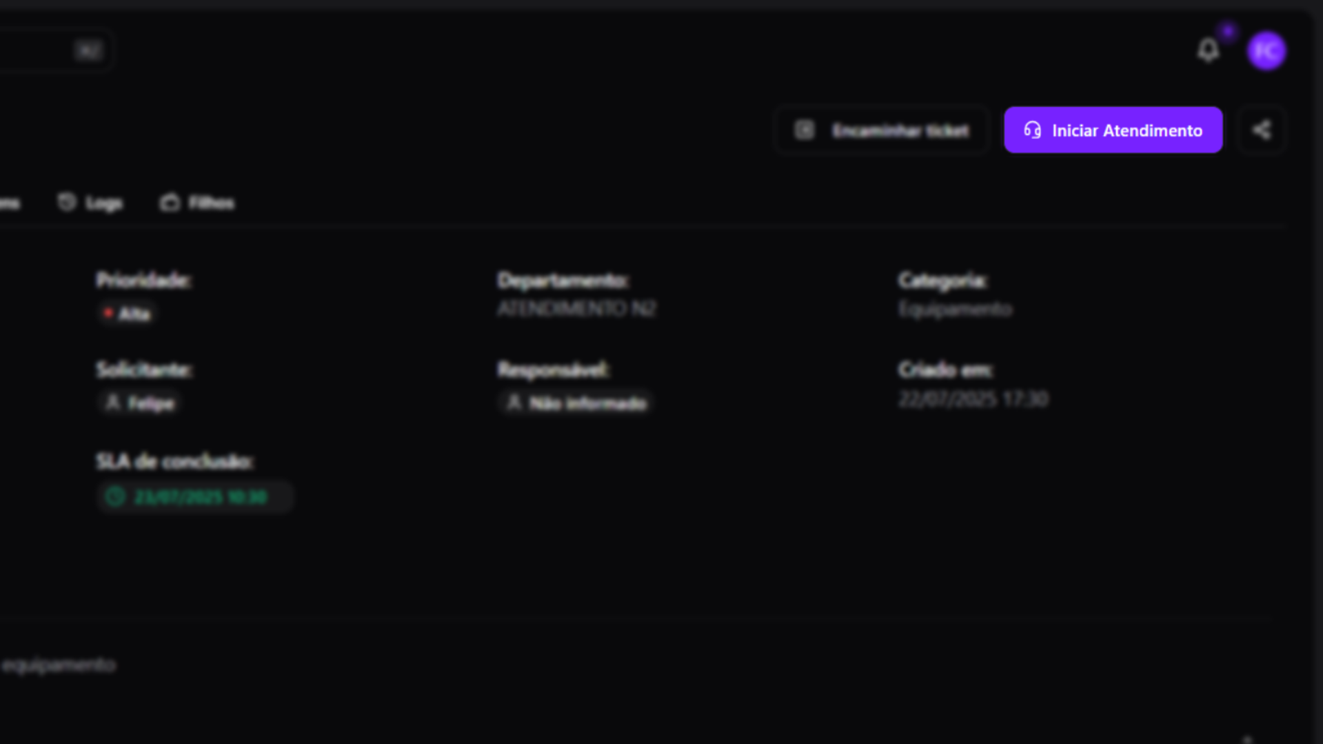 - SLA de conclusão: corresponde ao prazo definido para o ticket pai, ou seja, o chamado principal.