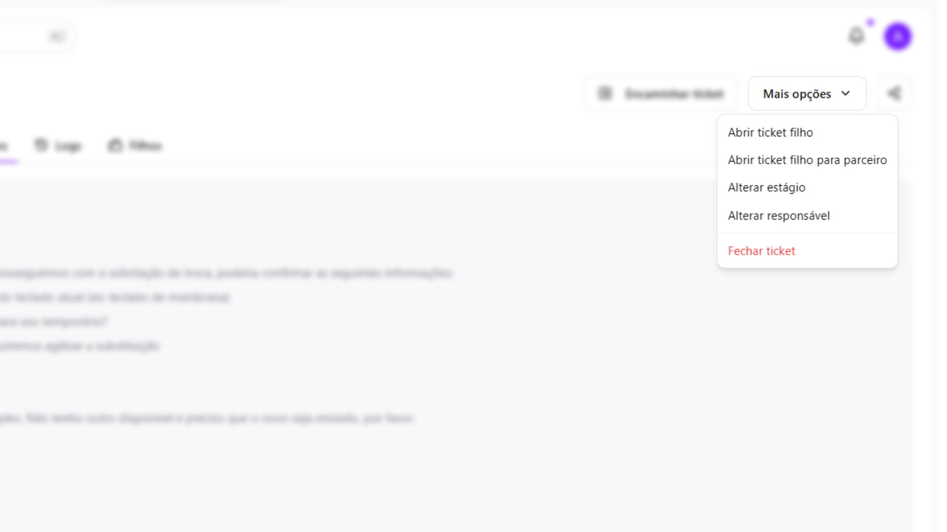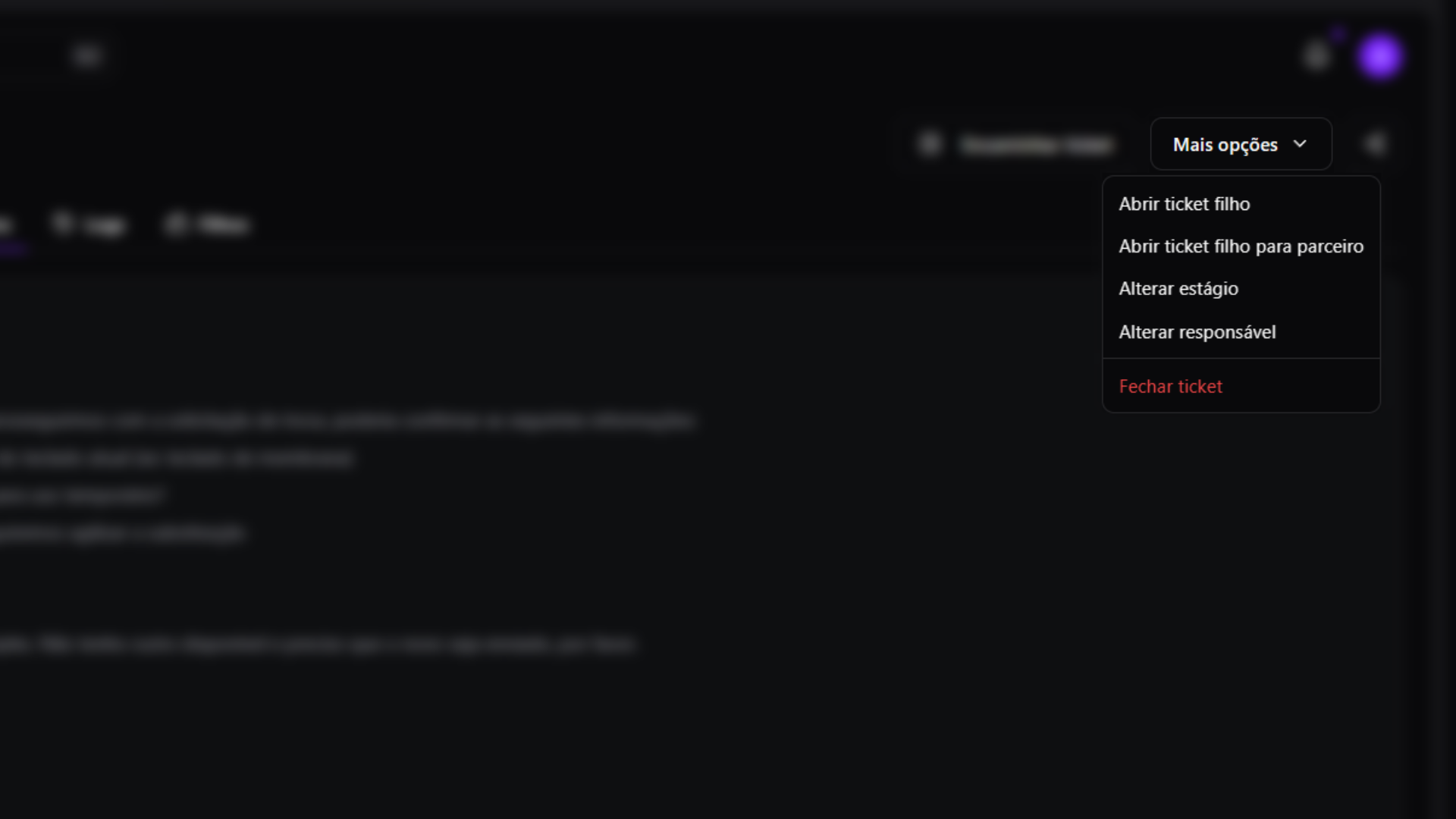 Ao encerrar um ticket filho, o sistema oferece a opção de abrir um novo ticket, conhecido como ticket irmão. Essa funcionalidade é útil quando você precisa continuar o atendimento ou criar uma nova demanda relacionada ao ticket pai, mantendo a rastreabilidade entre eles.