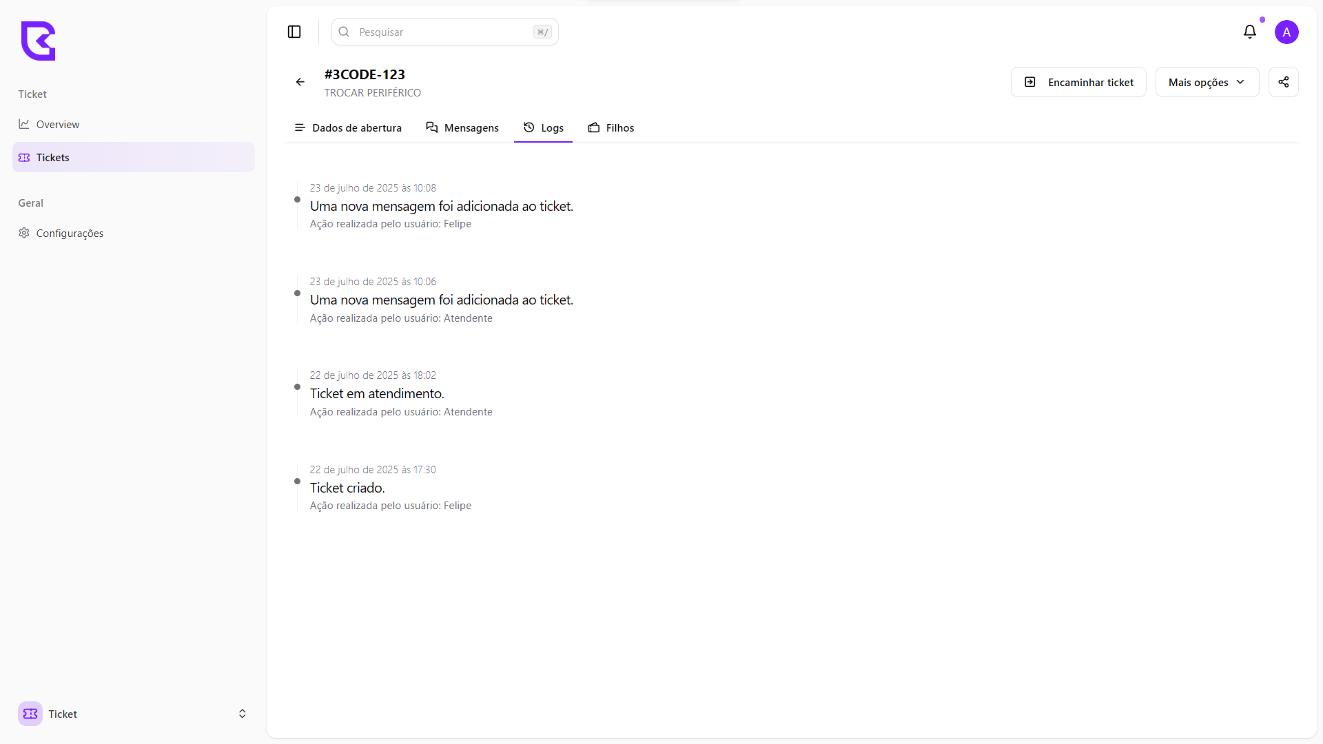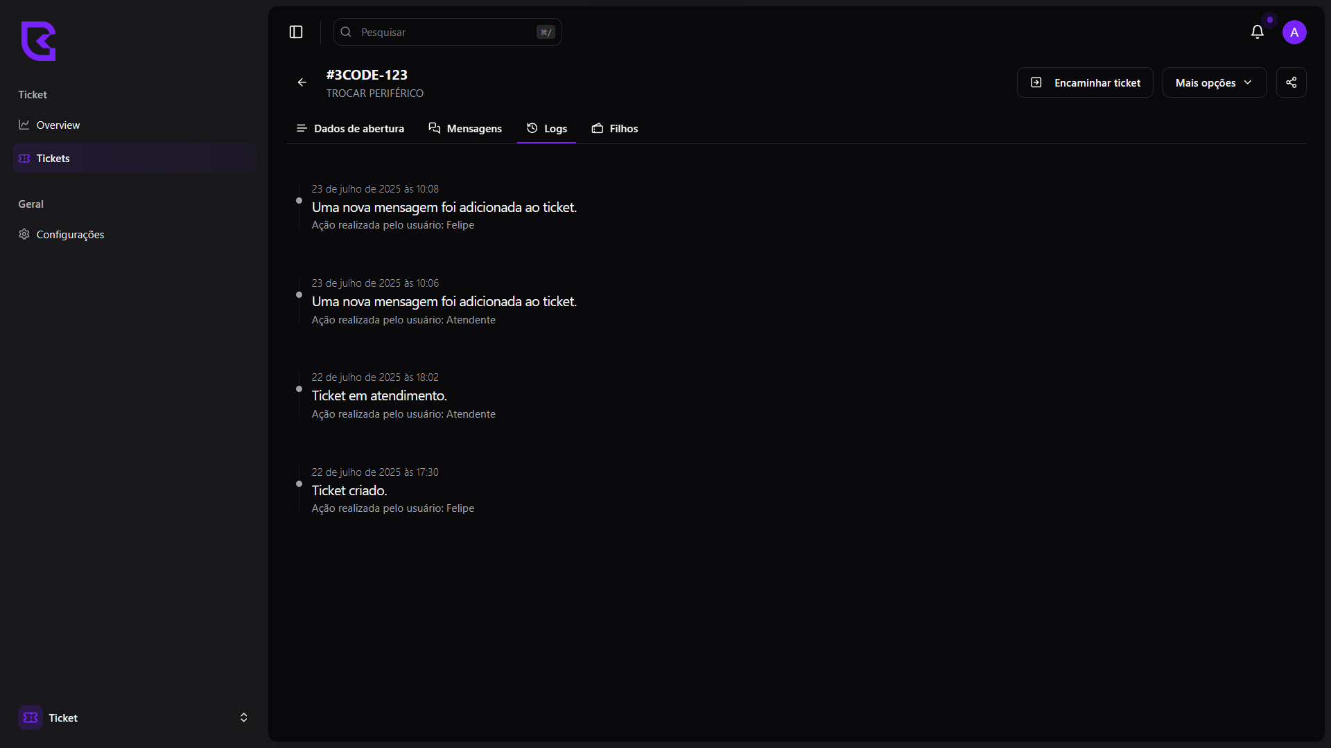A aba de logs exibe o histórico completo de interações do ticket. Nela é possível visualizar todas as ações realizadas, como alterações de status, movimentações, mensagens enviadas, edições e responsáveis envolvidos. Essa visualização ajuda no acompanhamento e auditoria do atendimento.