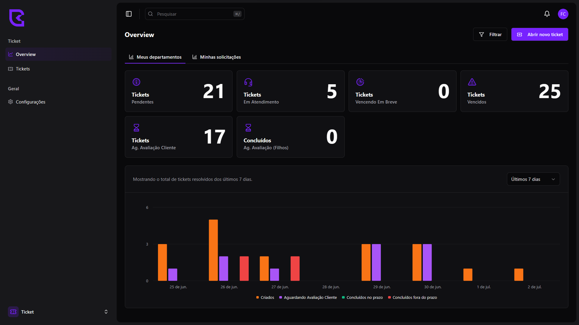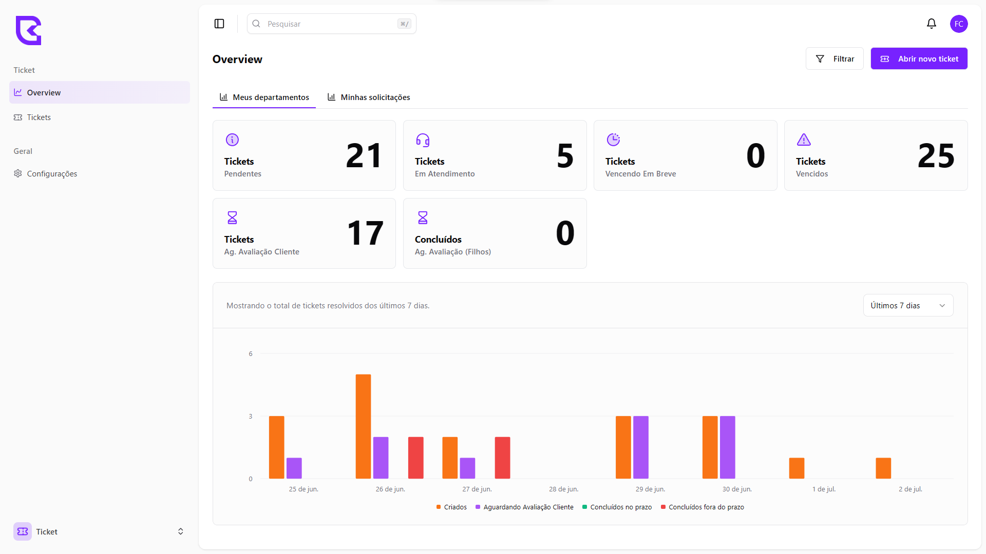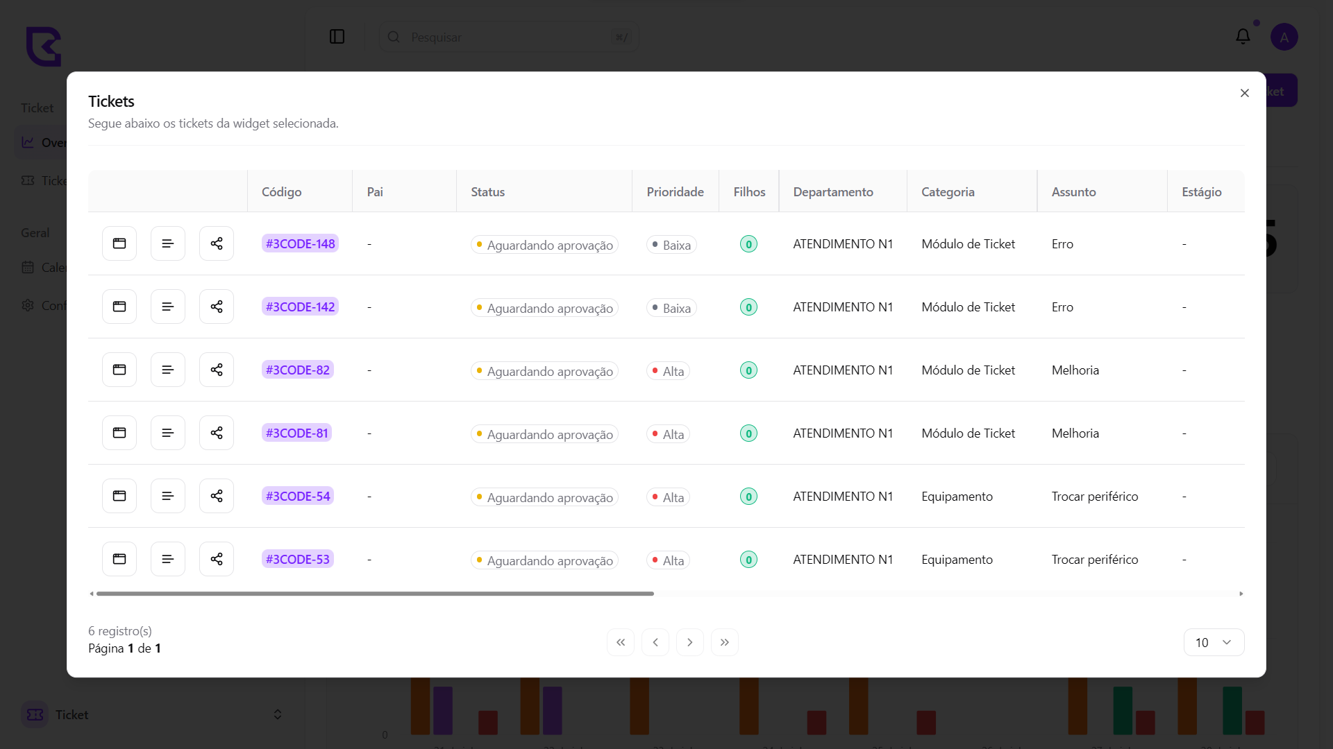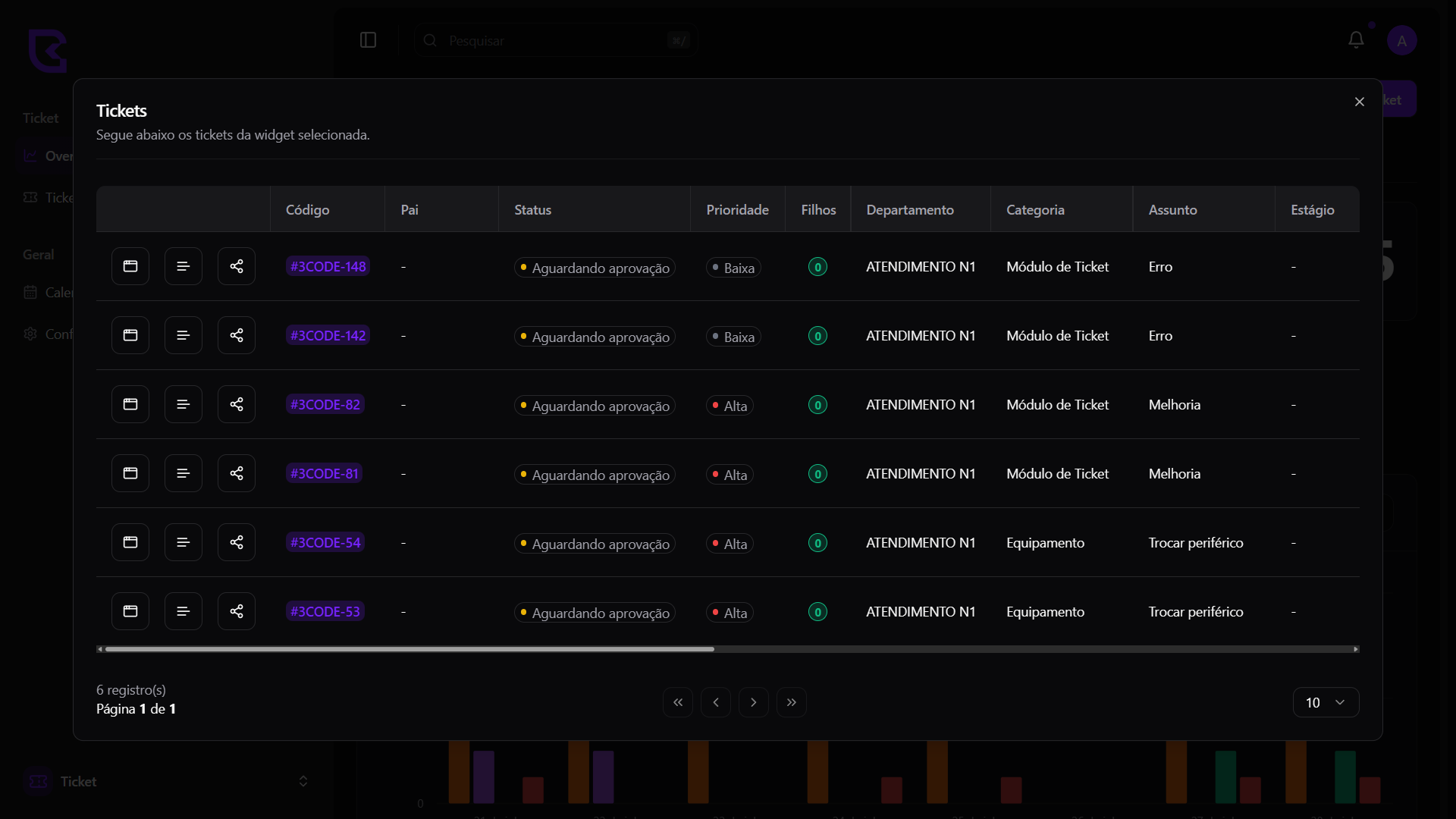 Usuários que possuem permissão para aprovar ou rejeitar tickets terão acesso a uma nova widget de “Aguardando aprovação” no overview do sistema. Nela, é possível visualizar rapidamente todas as solicitações que aguardam uma ação de aprovação. A necessidade de aprovação em um ticket está vinculada ao Assunto selecionado no momento da abertura. Quando um assunto é configurado como “Necessita de Aprovação”, qualquer ticket aberto com esse assunto será automaticamente direcionado para o status Aguardando aprovação, aguardando validação por um responsável. Essa configuração é importante para garantir que certas solicitações passem por uma análise ou autorização antes de seguirem para atendimento.Se quiser saber mais sobre configuração do assunto, clique