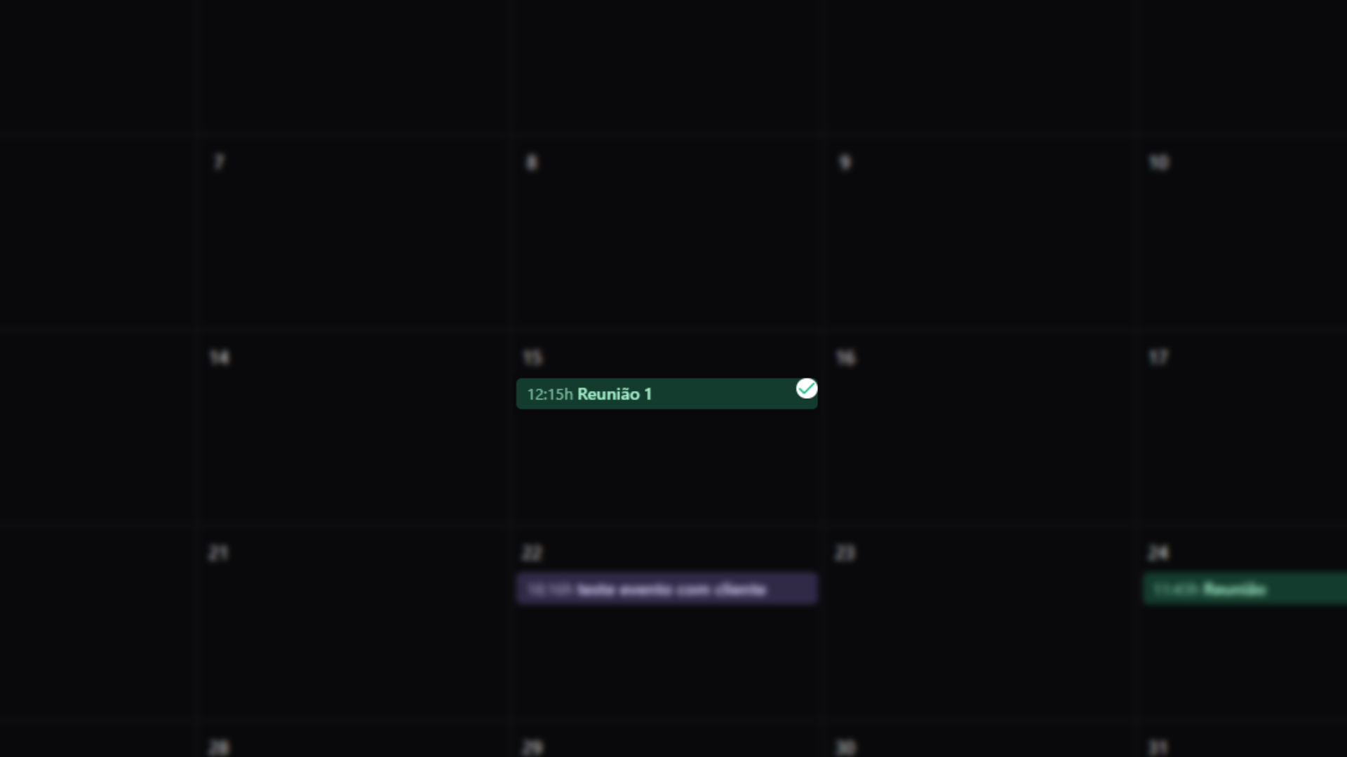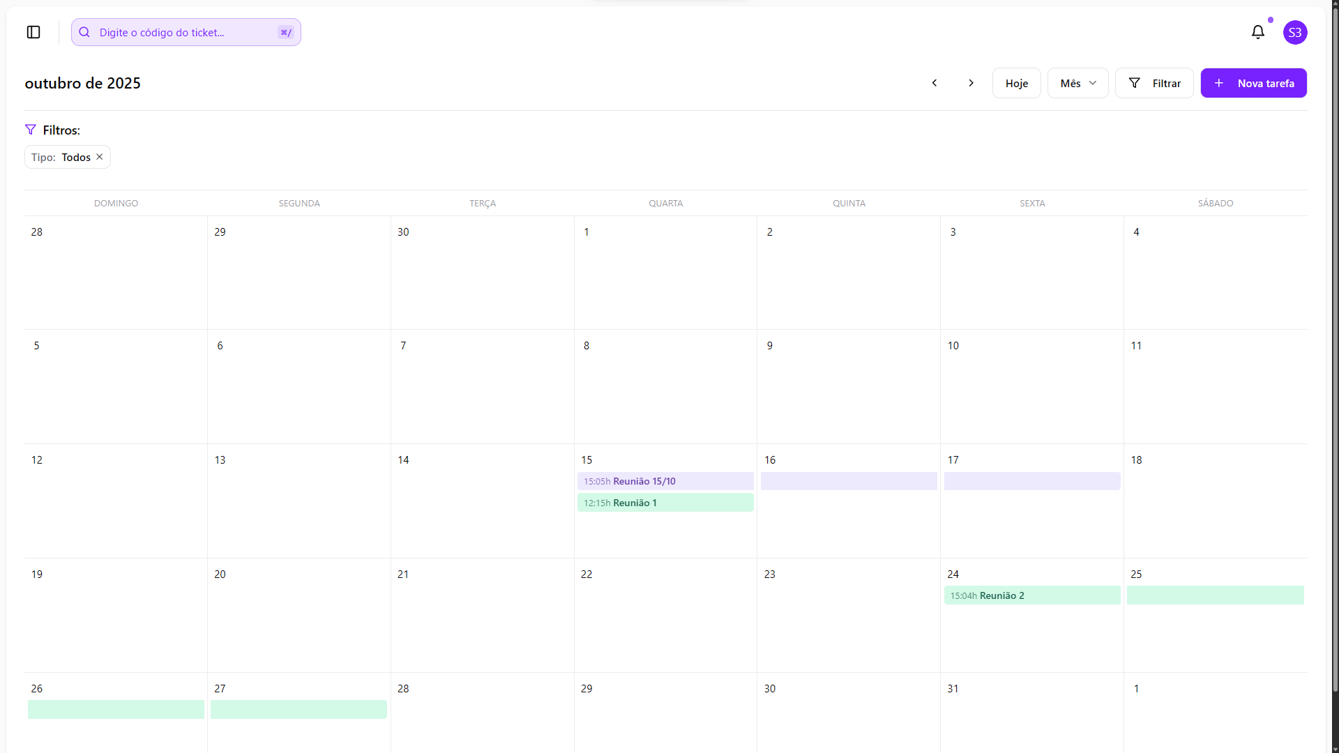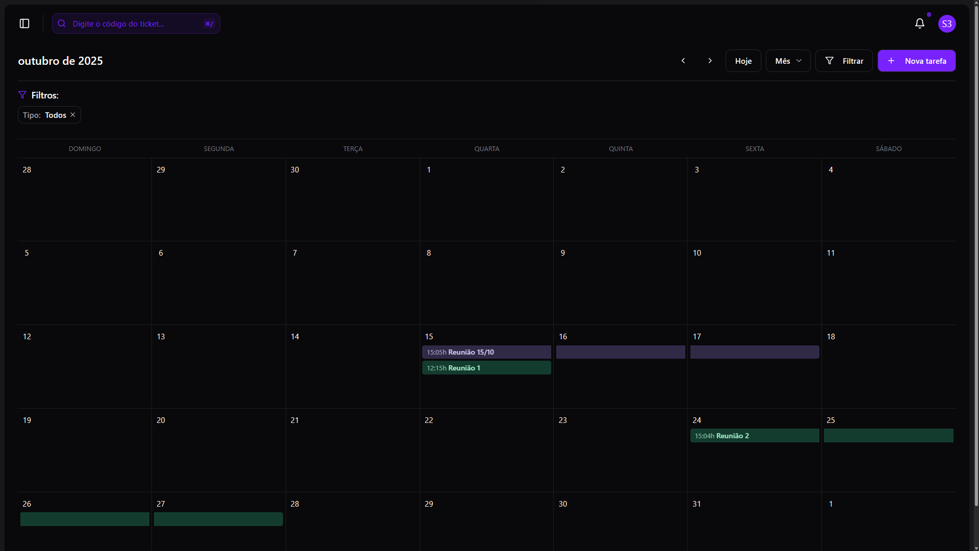 Quando uma atividade é adicionada através do ticket, ela aparece no calendário com uma cor específica verde, permitindo fácil identificação visual das tarefas vinculadas aos tickets.