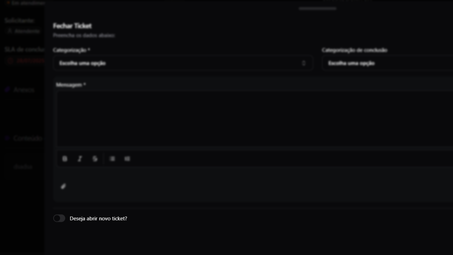 Para fechar o ticket, clique no botão Mais opções e selecione Fechar ticket. Um formulário será exibido para você confirmar as informações de encerramento.