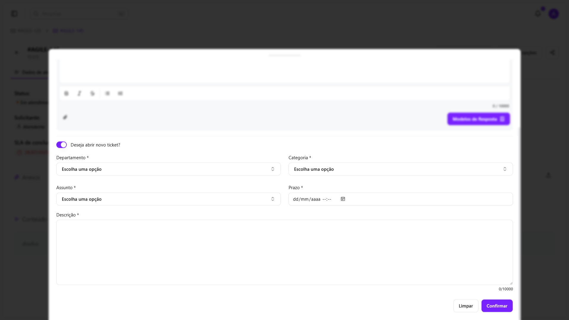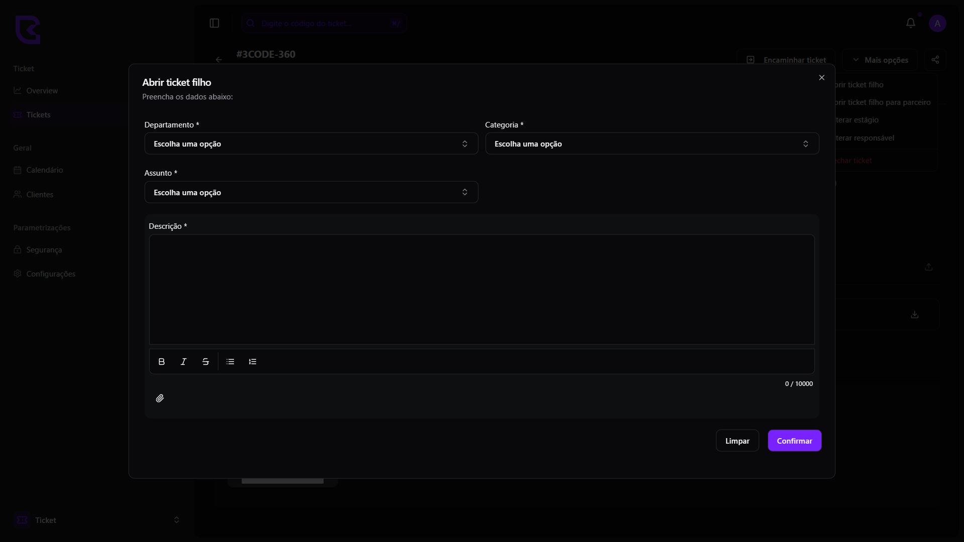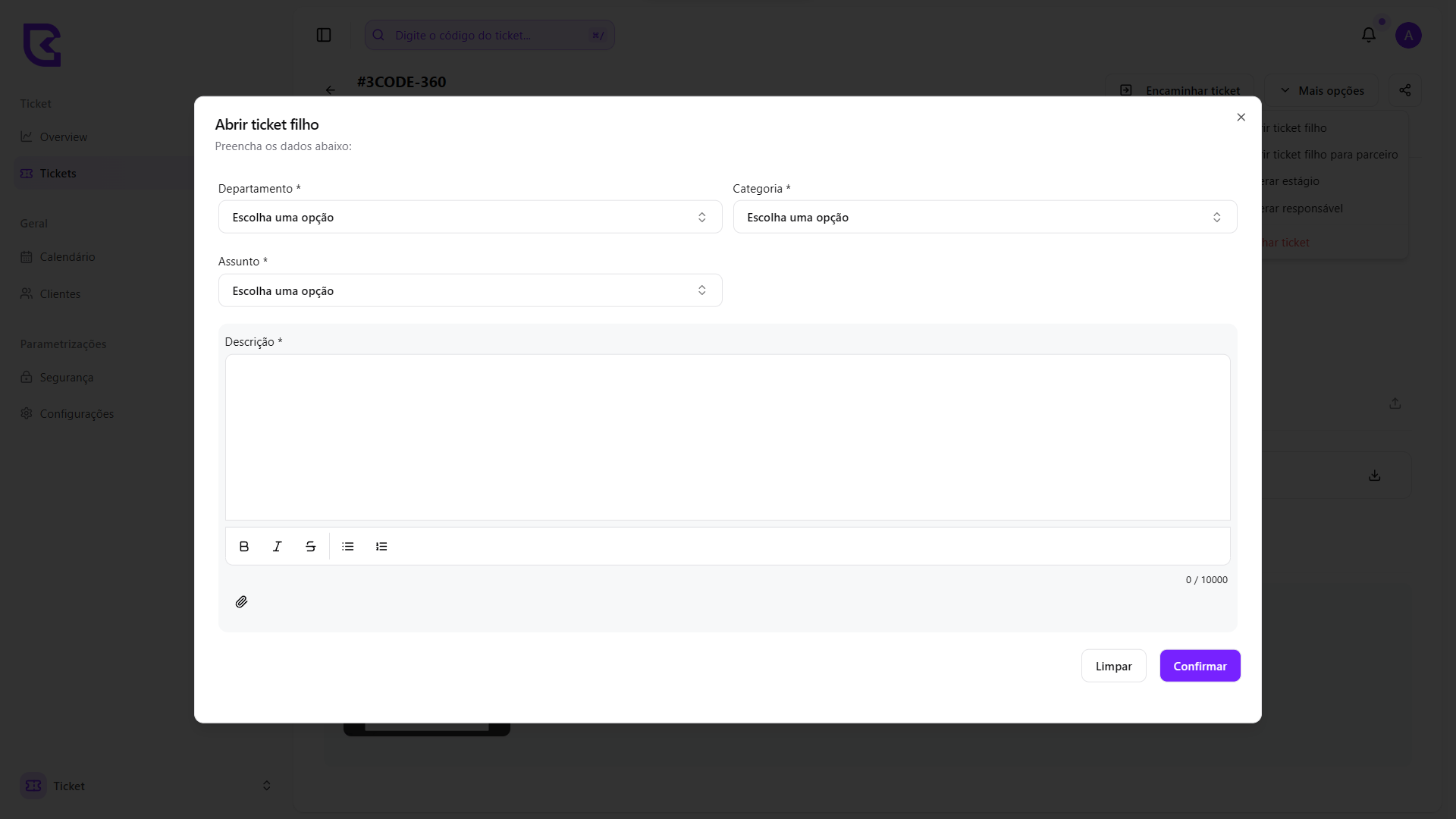Nesta tela, o usuário pode preencher as informações necessárias para abertura de um ticket filho, vinculando-o a um ticket pai existente. O formulário segue o mesmo padrão de usabilidade dos demais tickets, garantindo consistência na experiência.