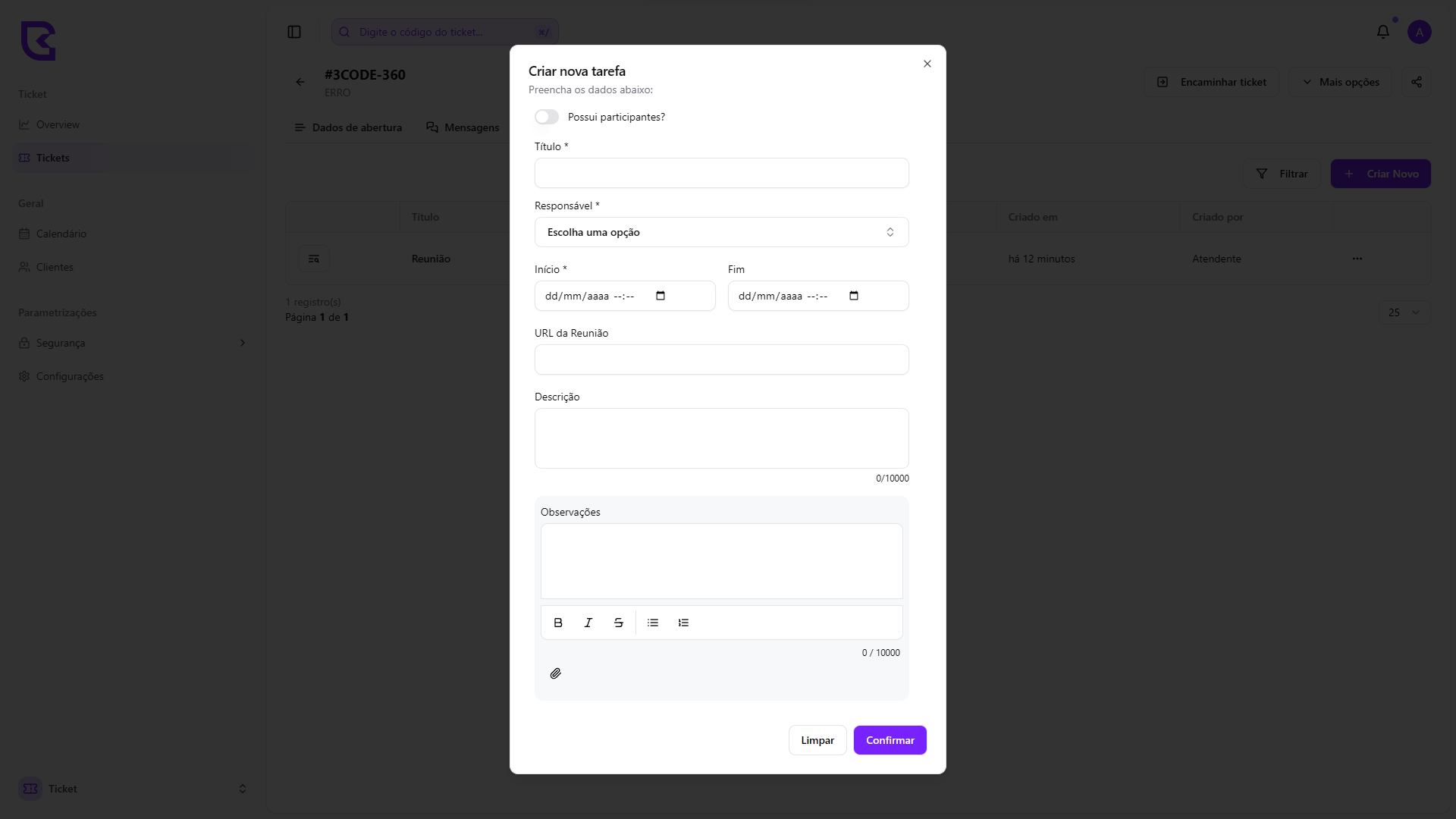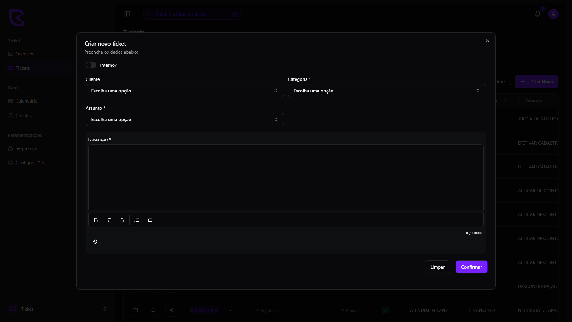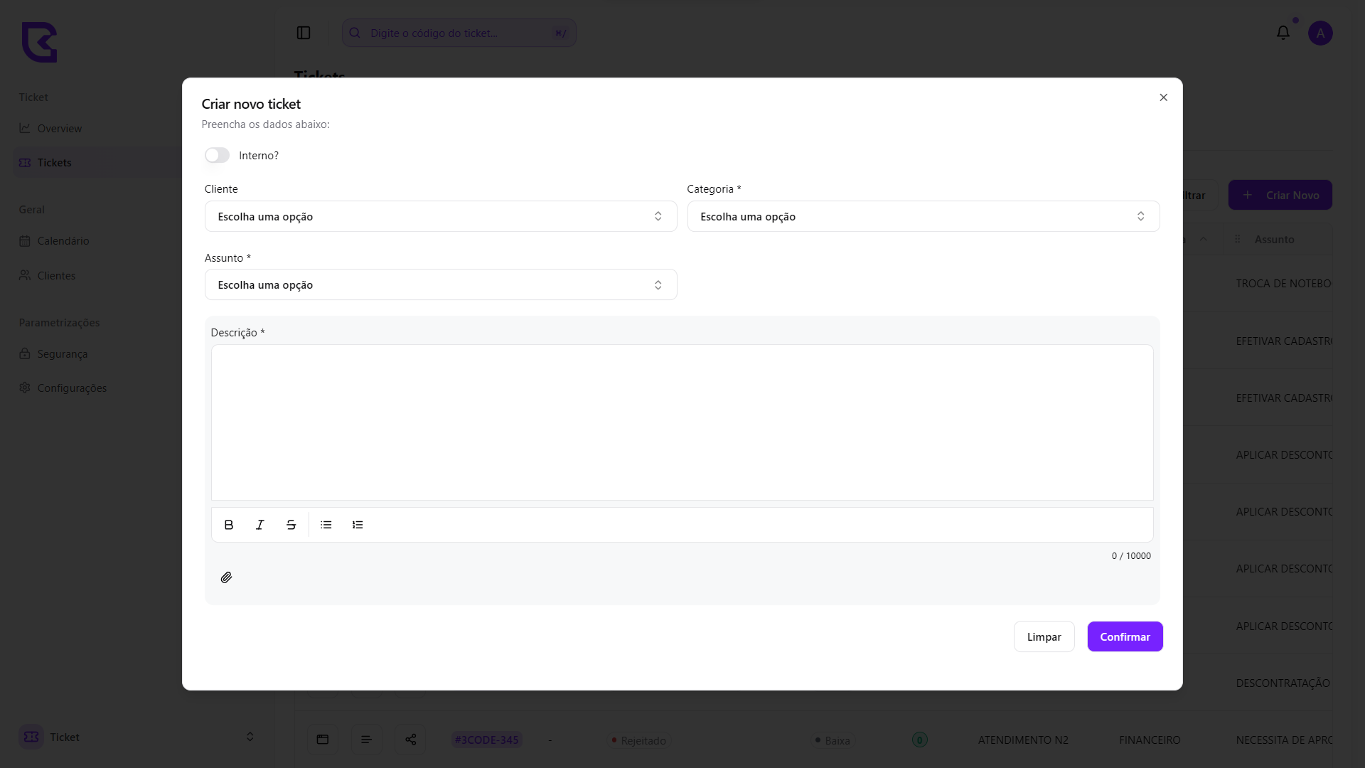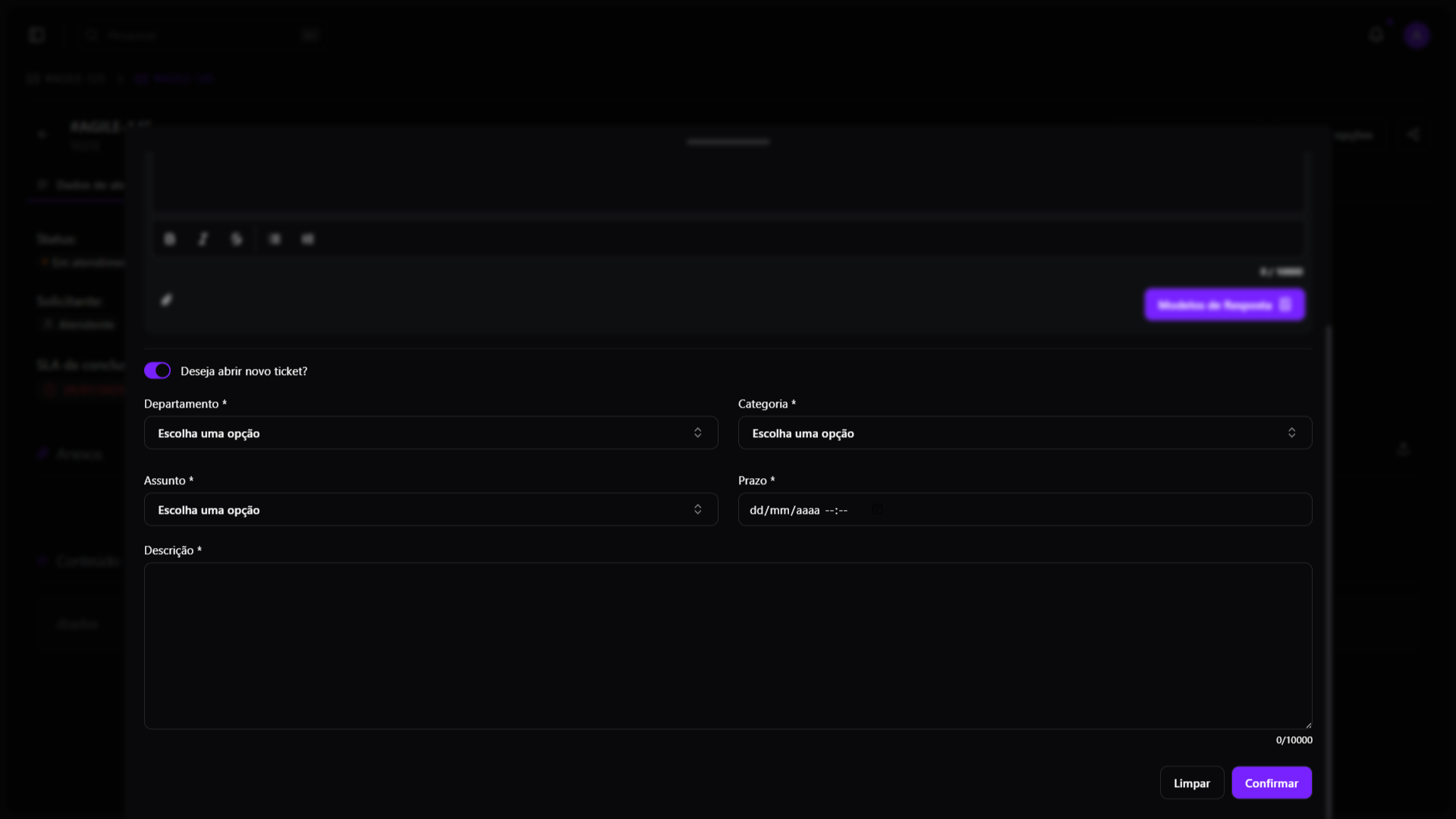 Nesta tela, o usuário pode preencher as informações necessárias para abertura de um ticket filho, vinculando-o a um ticket pai existente. O formulário segue o mesmo padrão de usabilidade dos demais tickets, garantindo consistência na experiência.