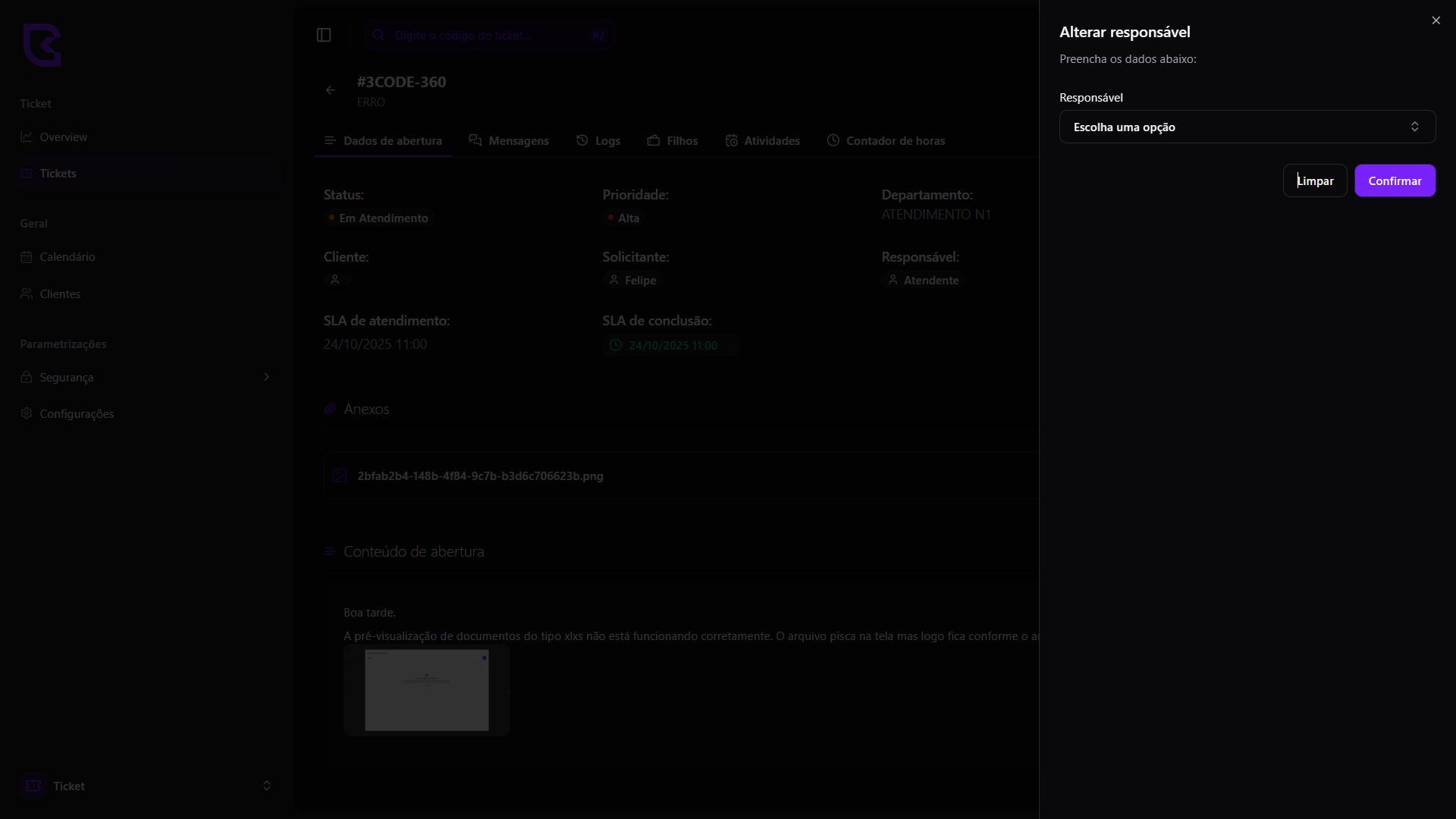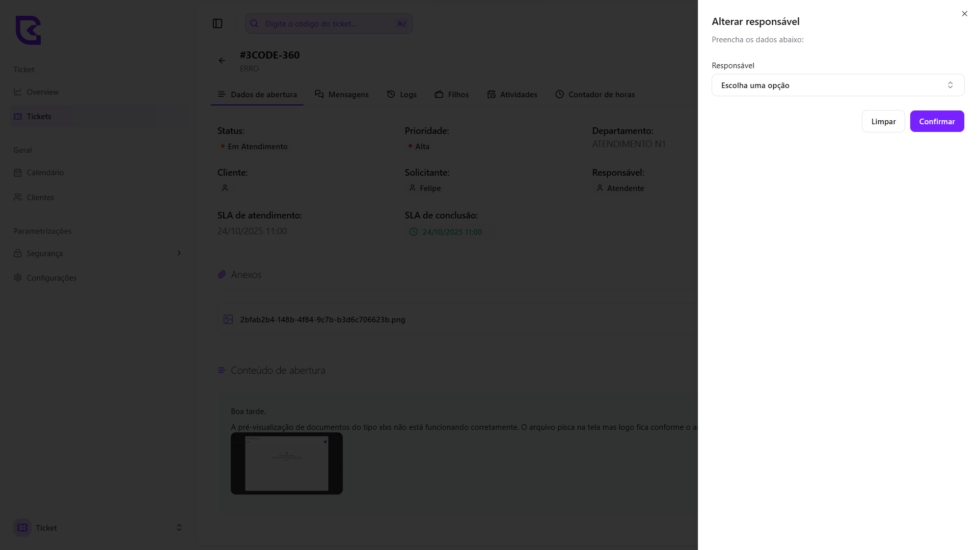 A troca de responsável de um ticket só pode ser realizada em situações específicas. Essa ação está disponível apenas para o usuário que abriu o ticket e possui permissão para alterar o responsável, ou para usuários com perfil de Supervisor. Além disso, a alteração só é permitida quando o ticket já estiver com o atendimento iniciado, ou seja, no status “Em Atendimento”. Caso seja necessário alterar responsáveis de múltiplos tickets de forma simultânea, existe a funcionalidade de troca de responsável em massa, que permite realizar essa ação de maneira prática e rápida. Se quiser saber mais sobre a troca de responsável em massa, clique aqui.