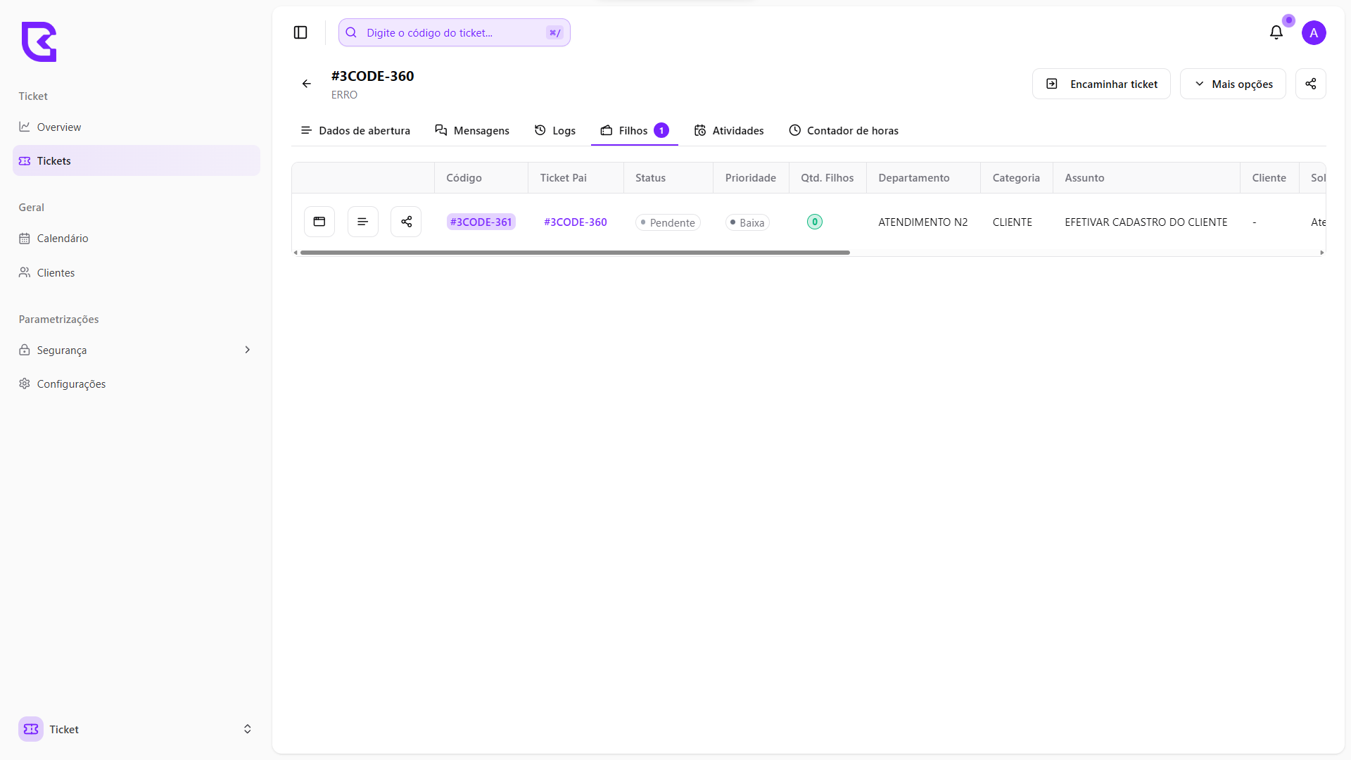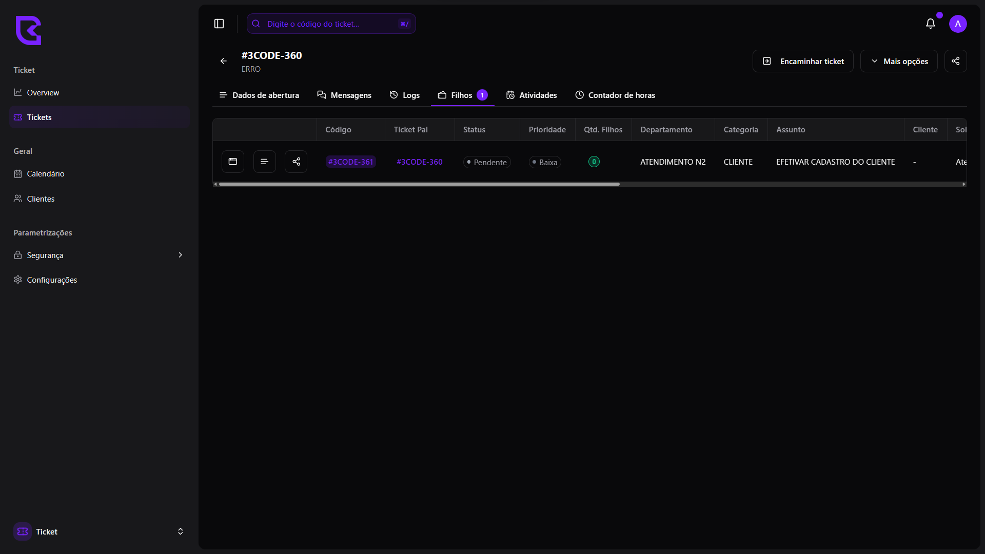 No topo da tela de detalhes, é exibido um destaque com o número do ticket pai, facilitando a identificação da solicitação principal — como no exemplo mostrado com o número #3CODE-360. Isso garante que o relacionamento entre os tickets esteja sempre visível para o usuário.