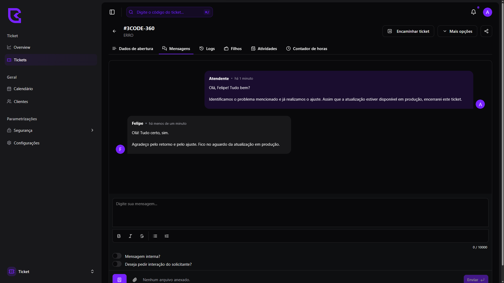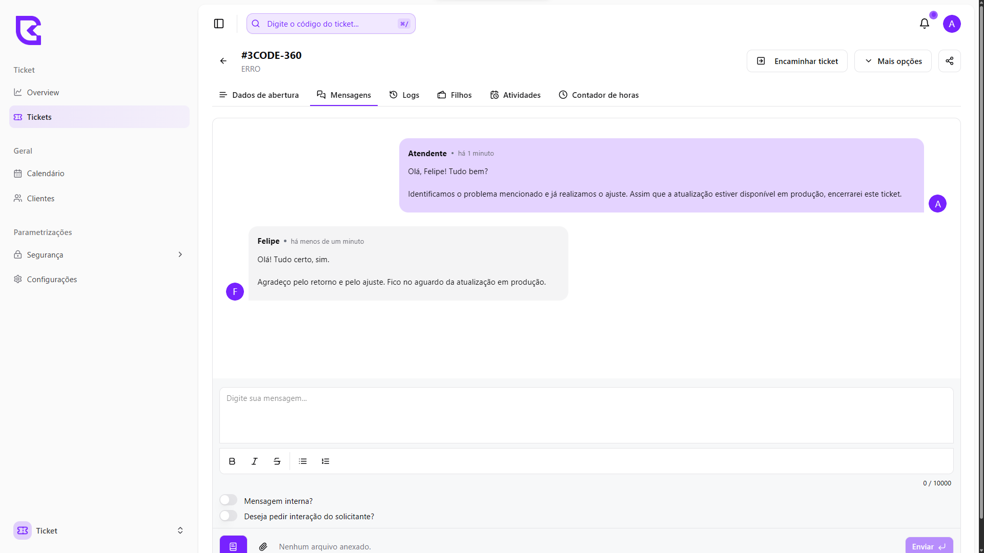 Esta aba exibe o histórico de mensagens do ticket. Use este espaço para se comunicar com o solicitante, enviar atualizações, responder dúvidas e anexar arquivos quando necessário.