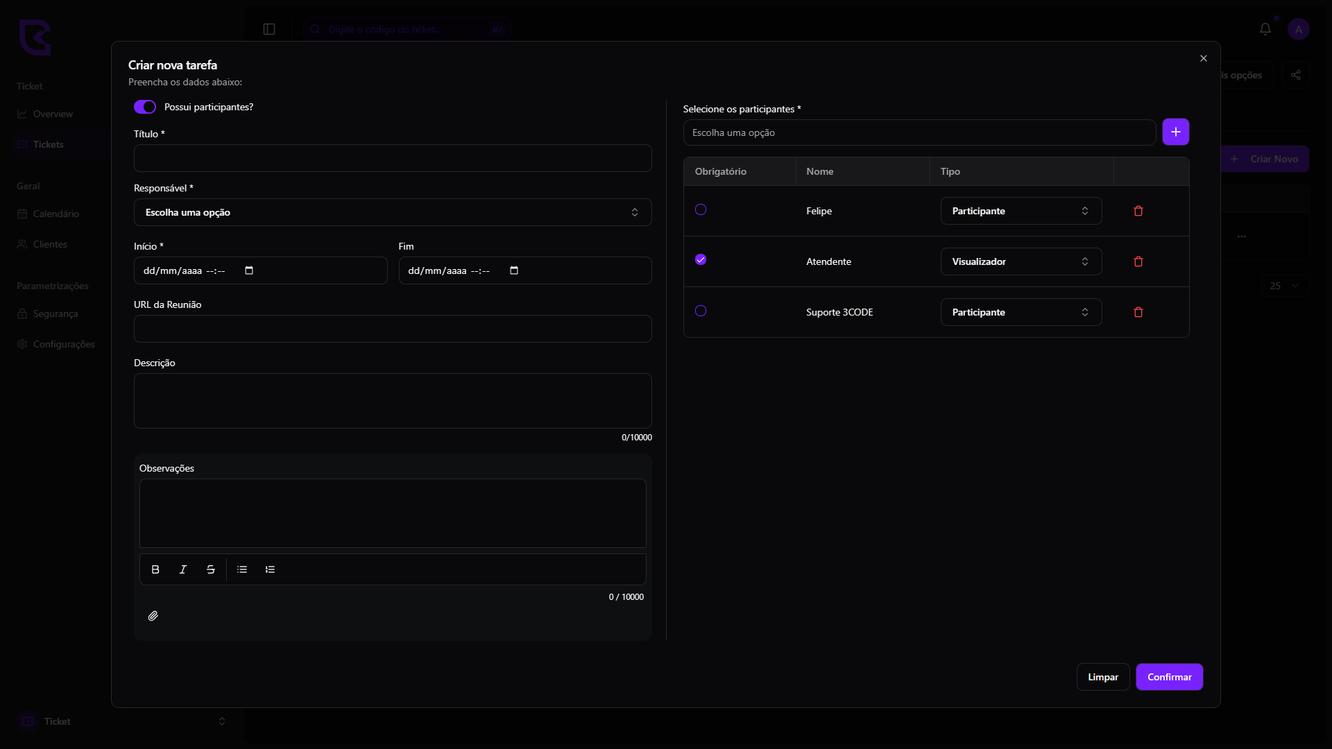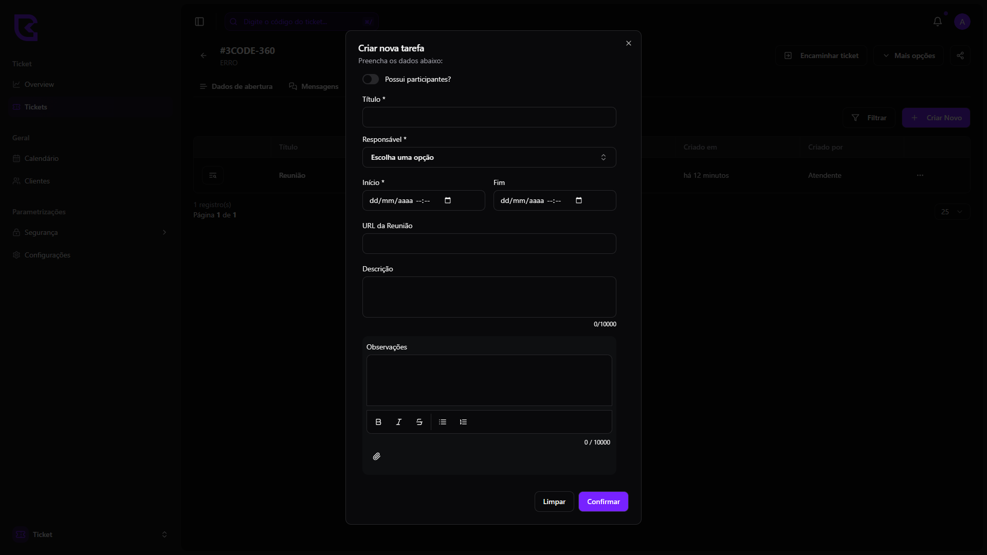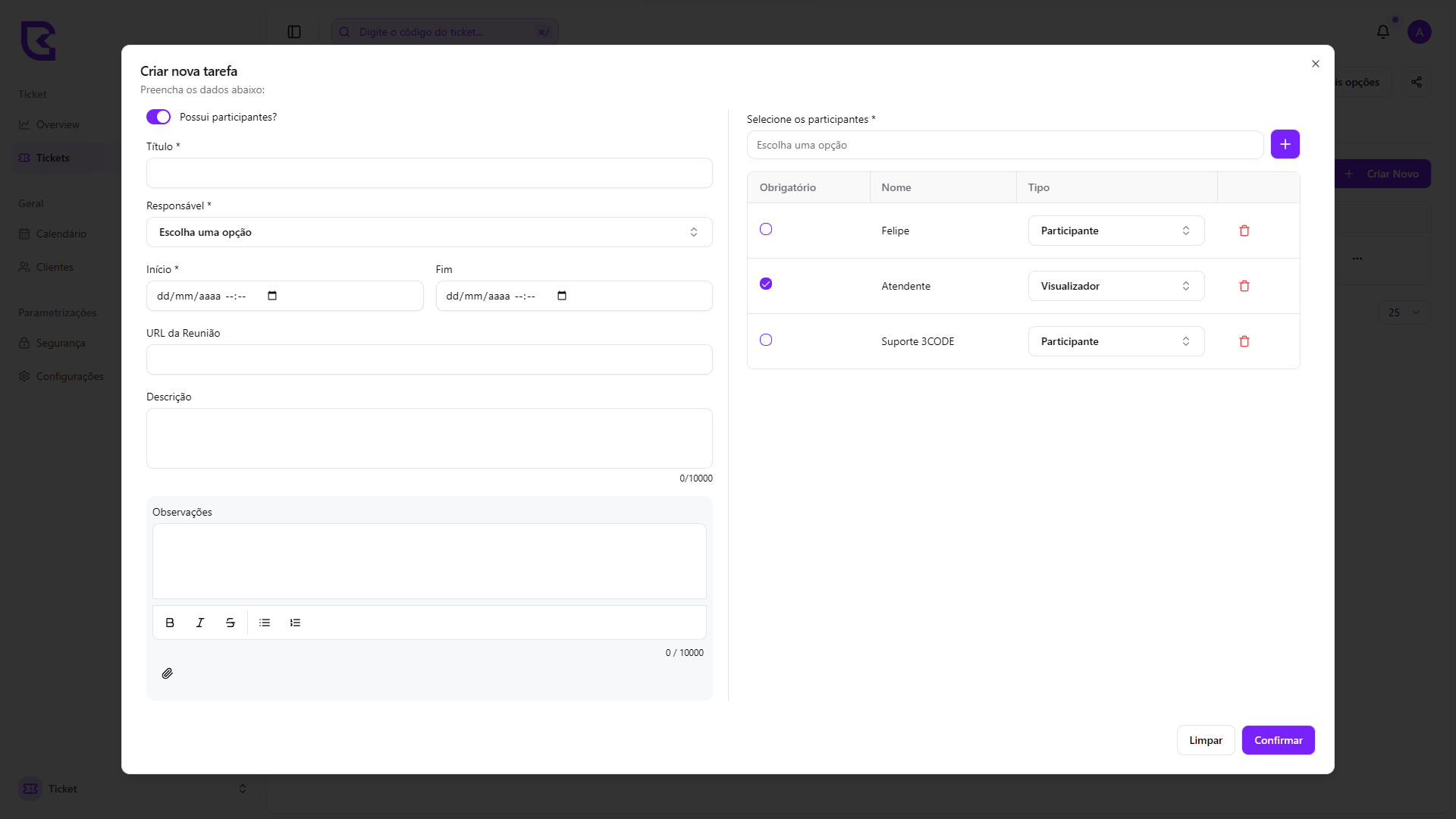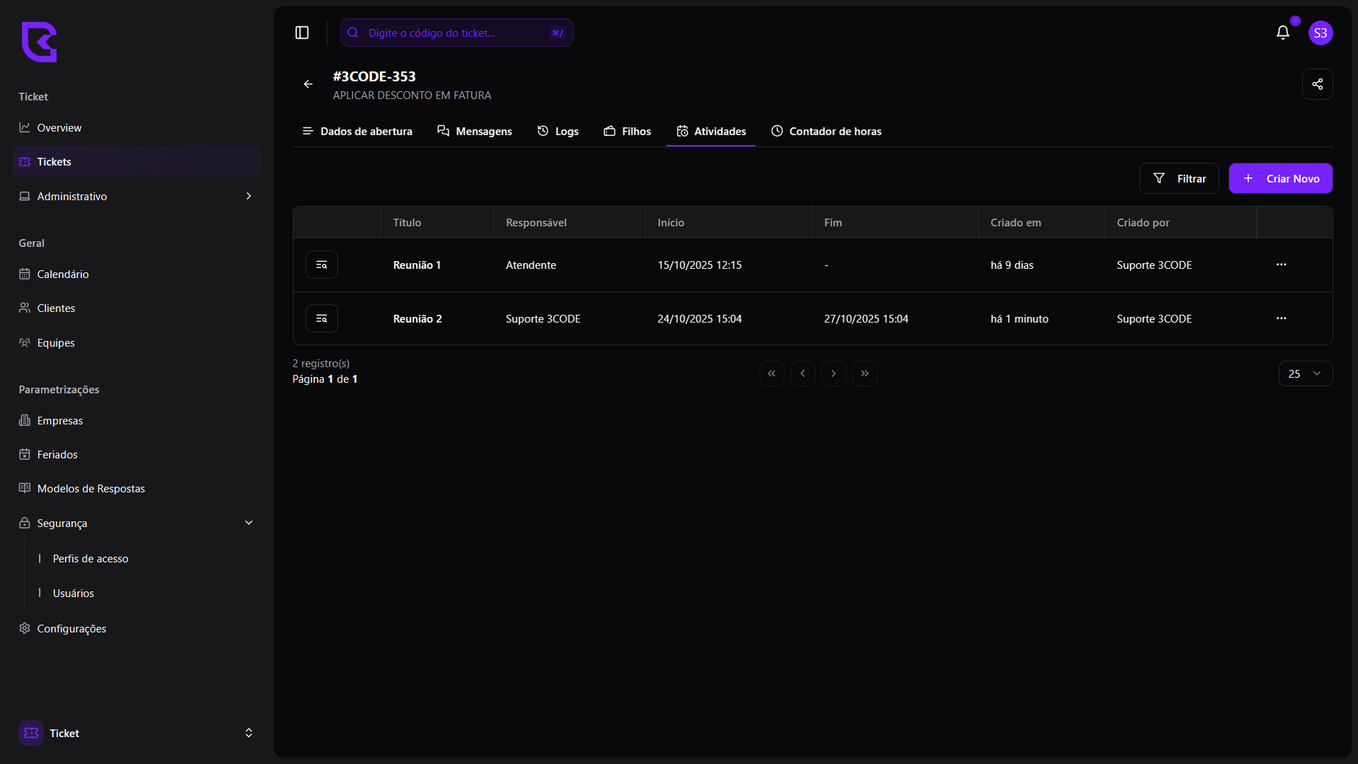As atividades servem para organizar e dividir o atendimento do ticket em tarefas menores, facilitando o gerenciamento e acompanhamento do trabalho. Em vez de lidar com um ticket grande e complexo, você pode criar múltiplas atividades específicas, cada uma com seu responsável, prazo e descrição detalhada. Esta funcionalidade é exclusiva para usuários internos que possuam permissão de visualizar calendário. As duas telas se integram, permitindo uma gestão completa das tarefas relacionadas ao ticket.Se quiser saber mais sobre o calendário, clique