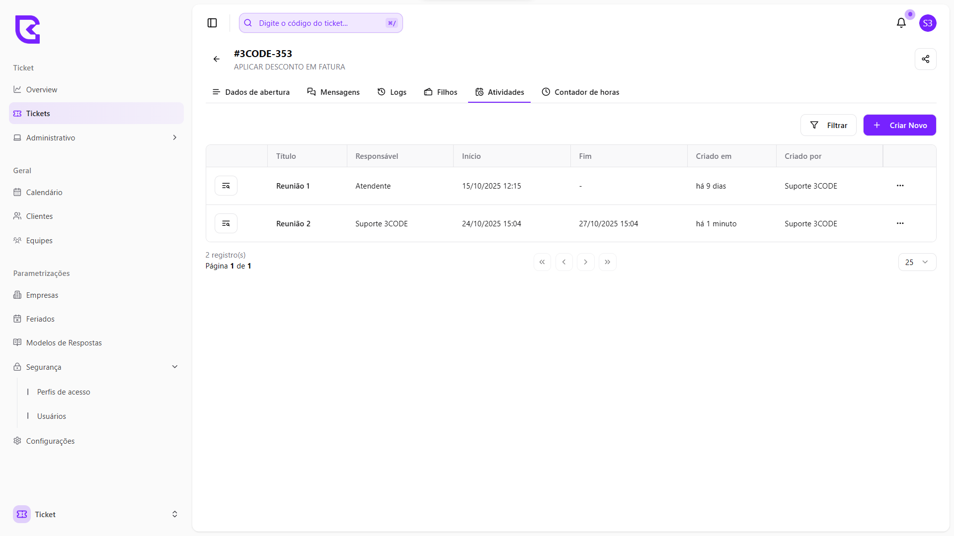 O grid exibe todas as atividades criadas para o ticket, permitindo visualização rápida do status, responsáveis e prazos de cada tarefa.